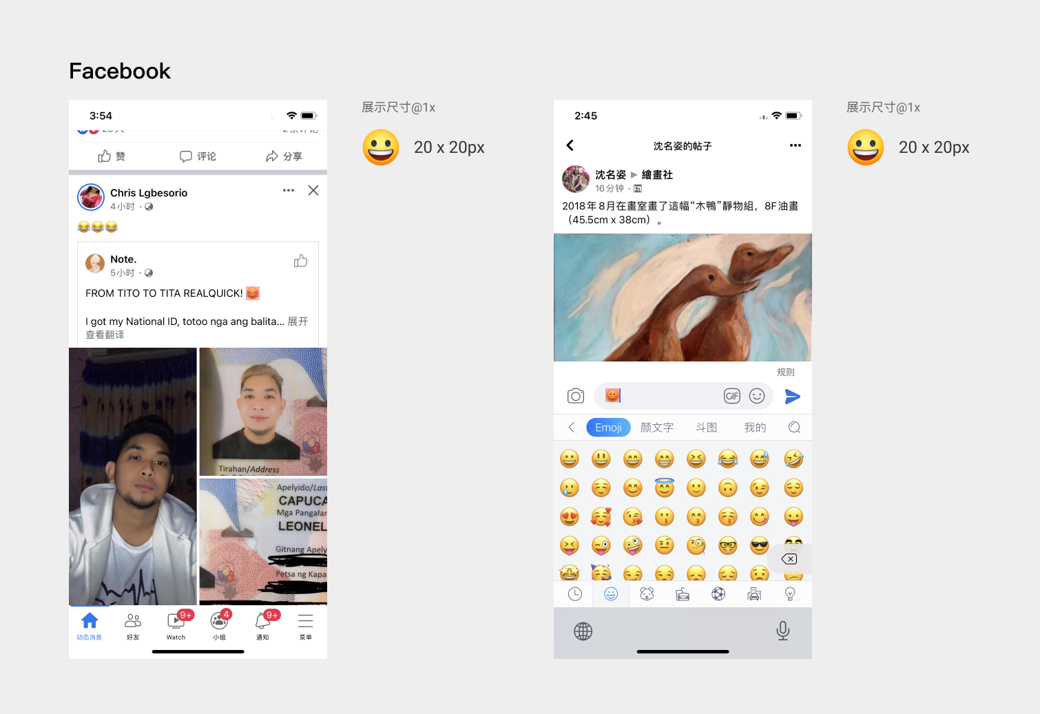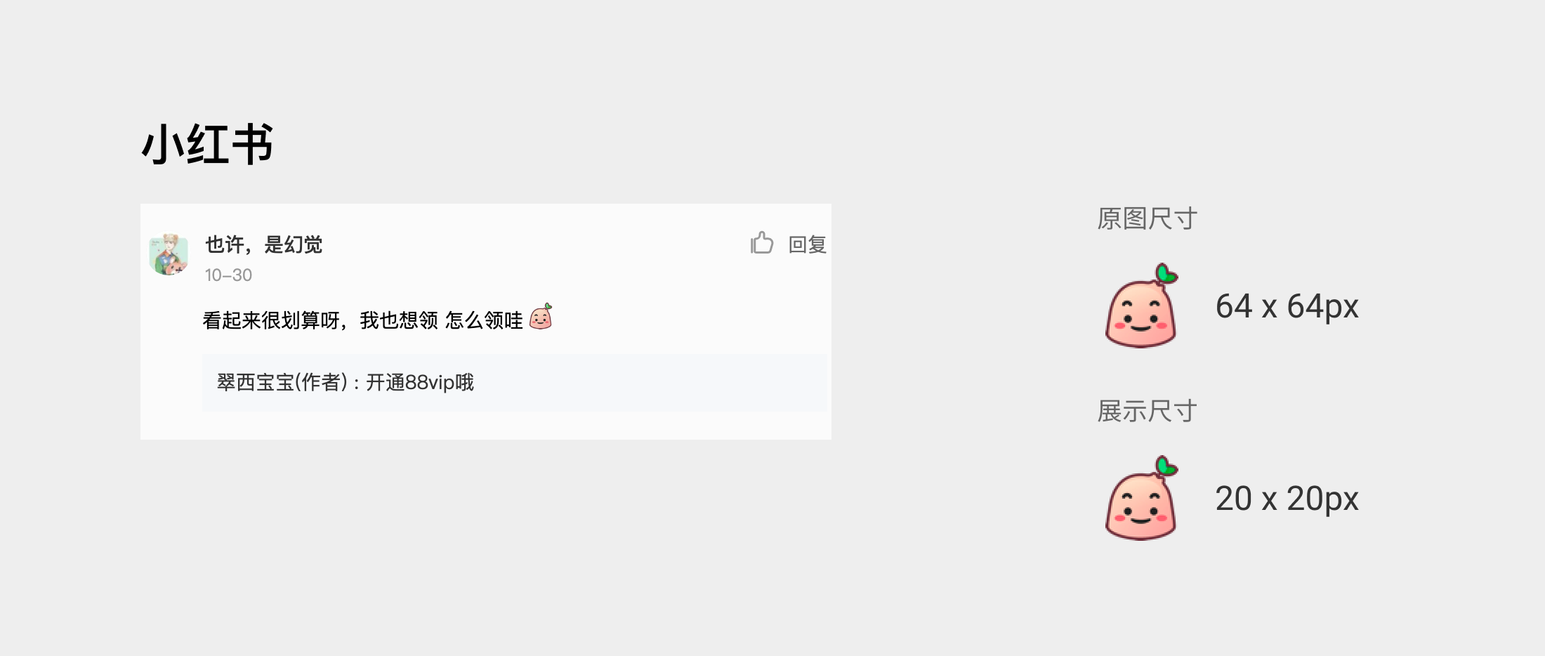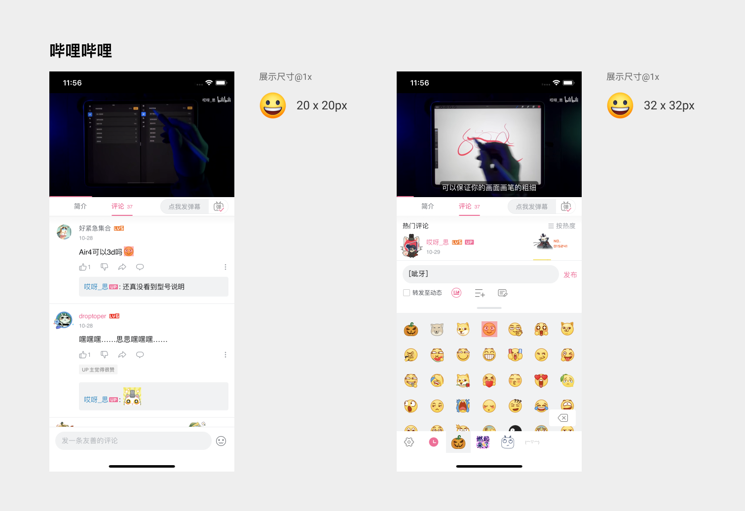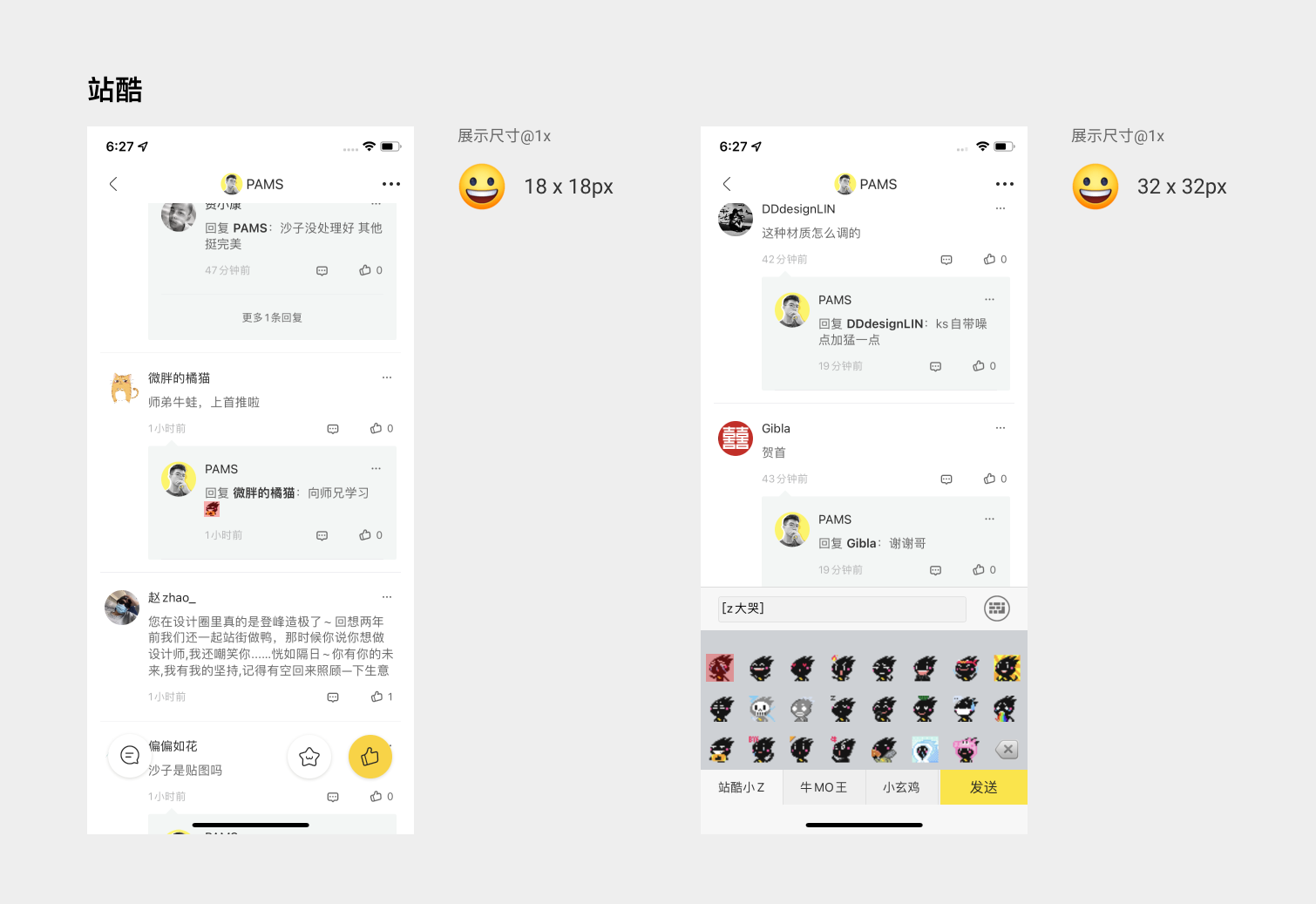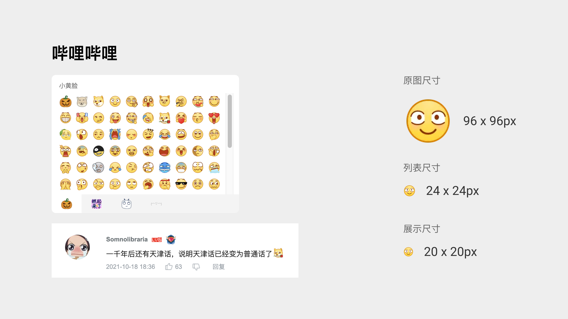 在不同的产品中我们也能够看到具有不同的IP形象或设计风格的表情符号。由于缺乏完善的表情符号设计规范,这里从 Web 和 App 端对其他产品表情符号的使用场景及尺寸规范进行探索。