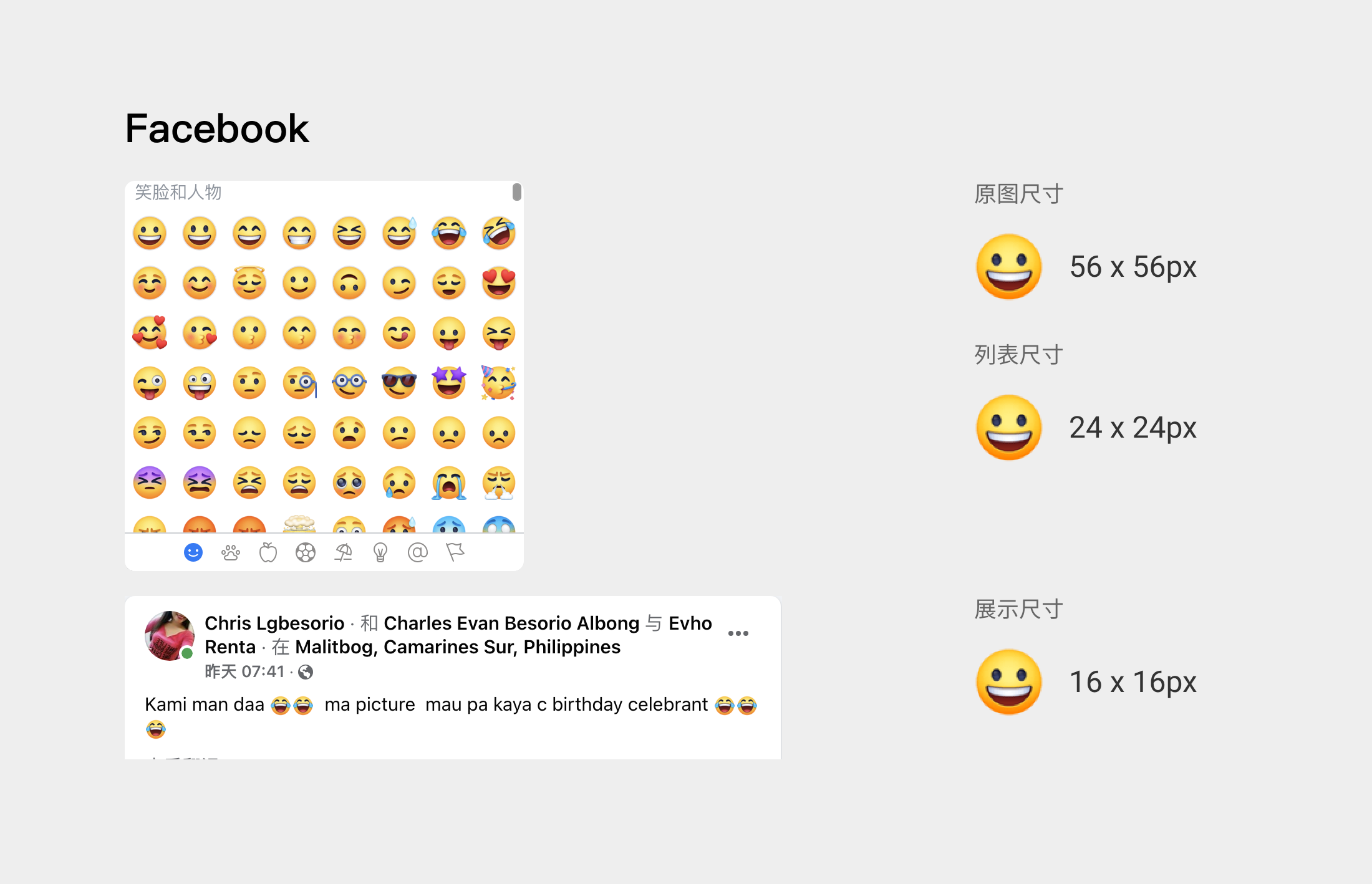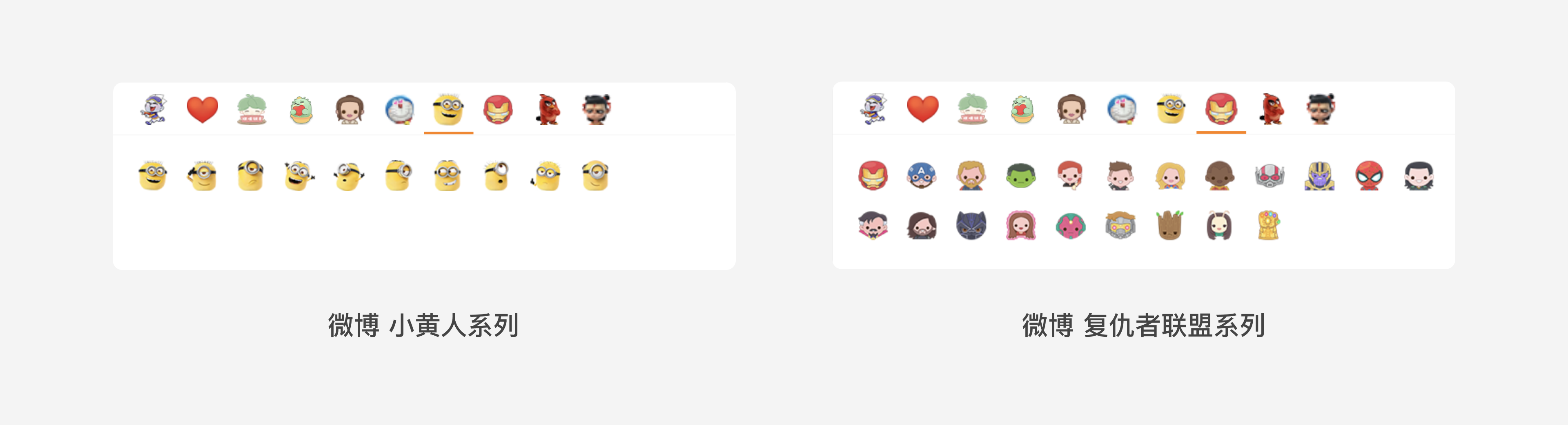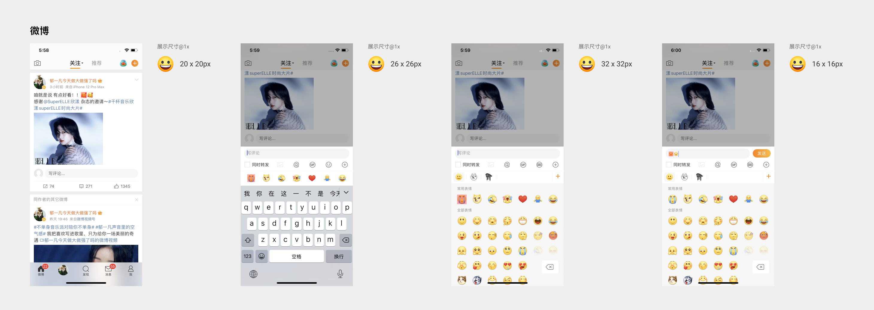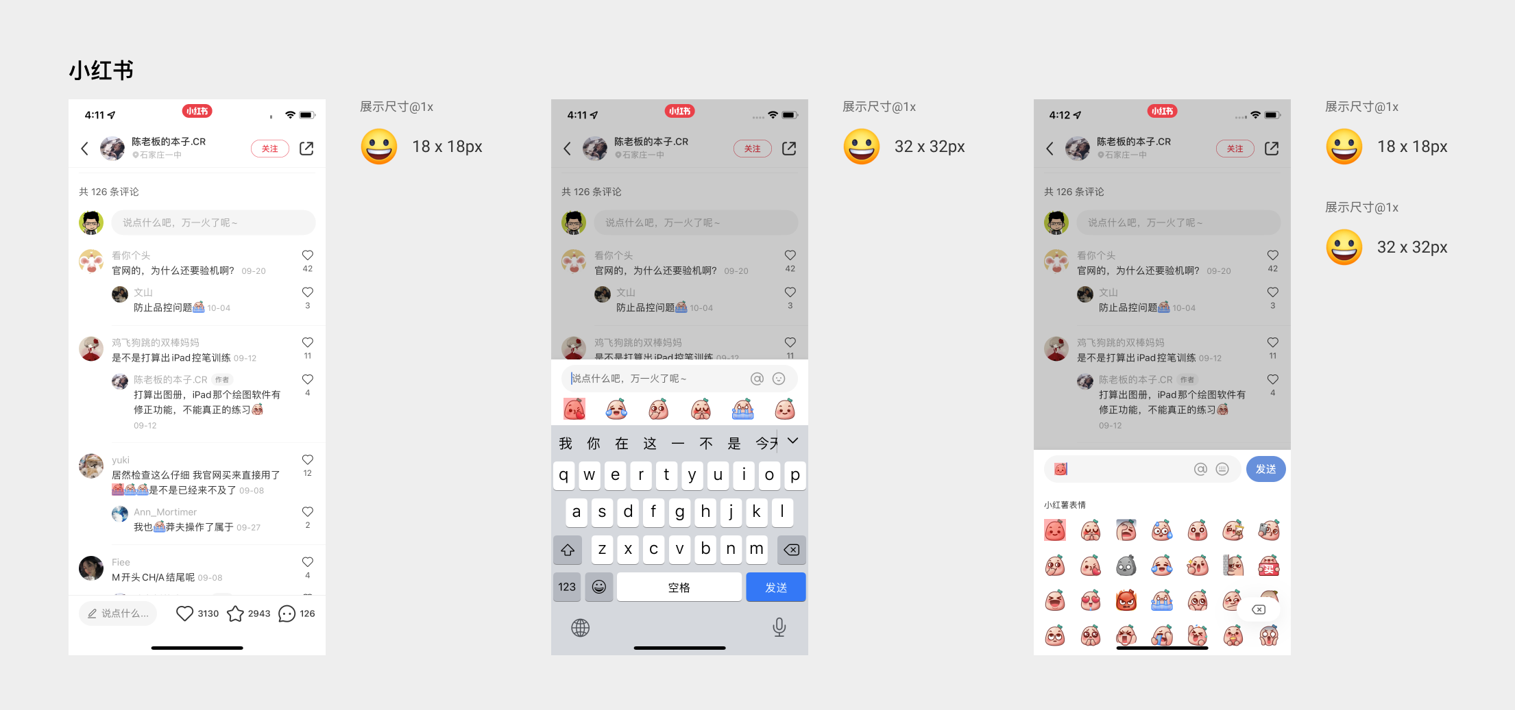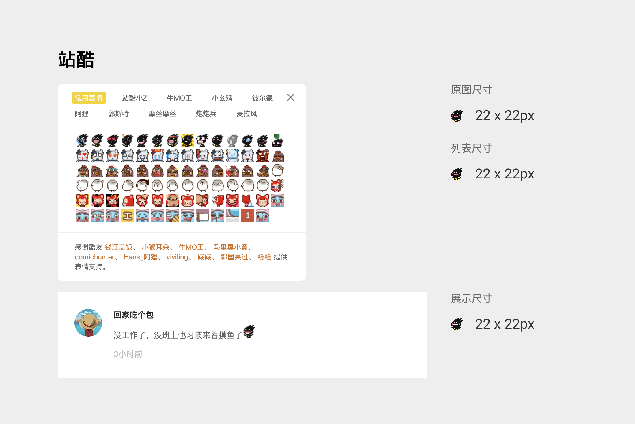 在不同的产品中我们也能够看到具有不同的IP形象或设计风格的表情符号。由于缺乏完善的表情符号设计规范,这里从 Web 和 App 端对其他产品表情符号的使用场景及尺寸规范进行探索。