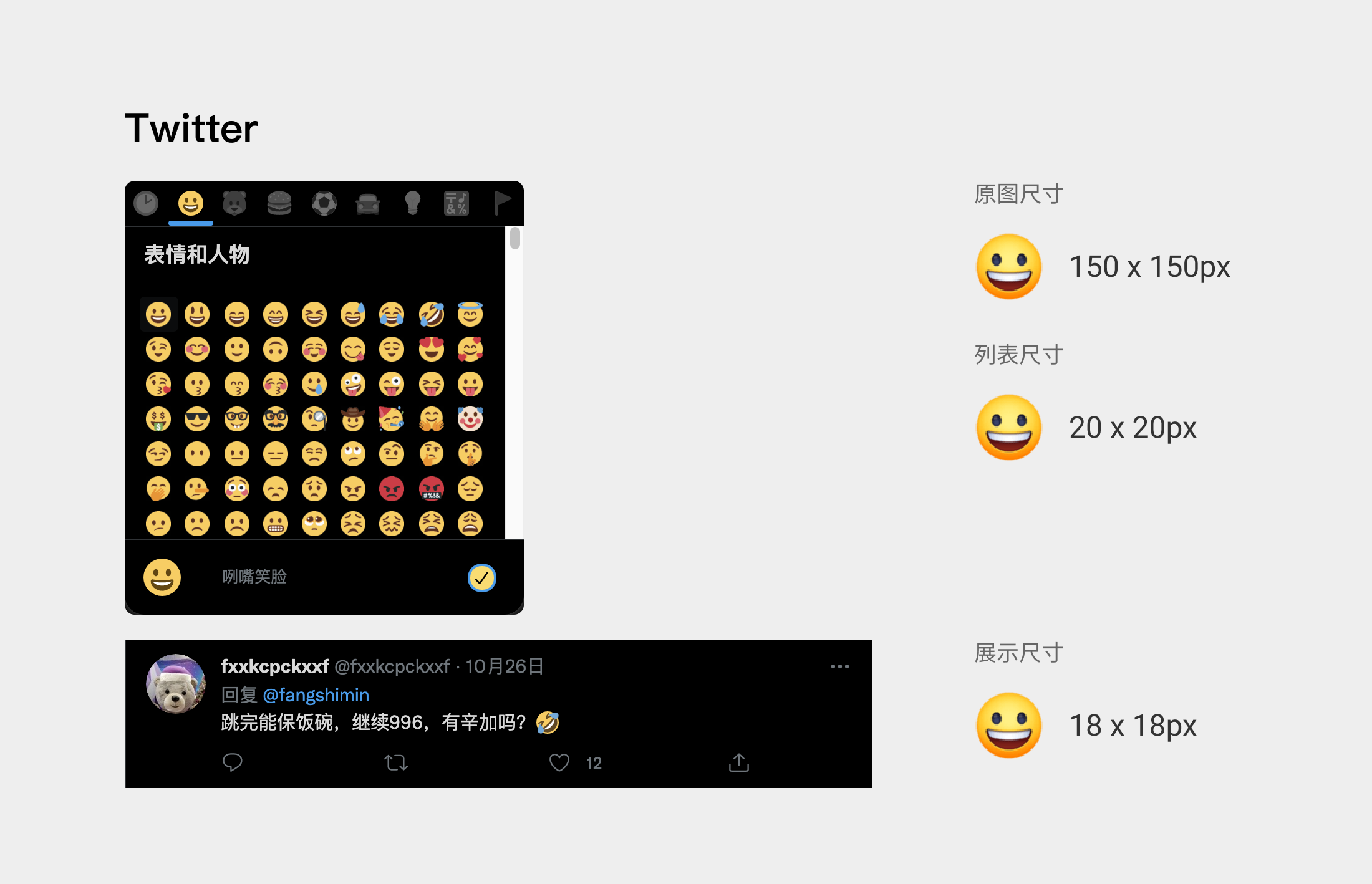 由于 Emoji 各家设计风格及展现尺寸不同,缺乏统一的设计规范参考,可参考 Emojination 的表情符号提交指南并结合其他产品的设计尺寸。