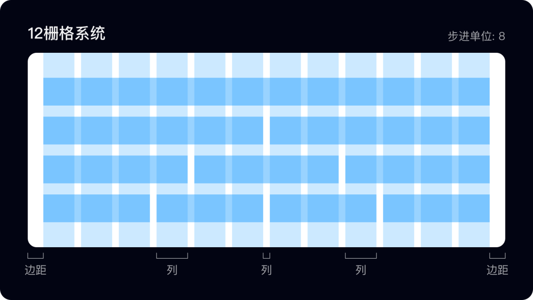 栅格可以理解为平台级的基准参考线,以一个最小网格单位将屏幕分成有序的网格,然后制定边距、间距以及分割方式,设计师可以依照栅格系统进行秩序和逻辑的设计