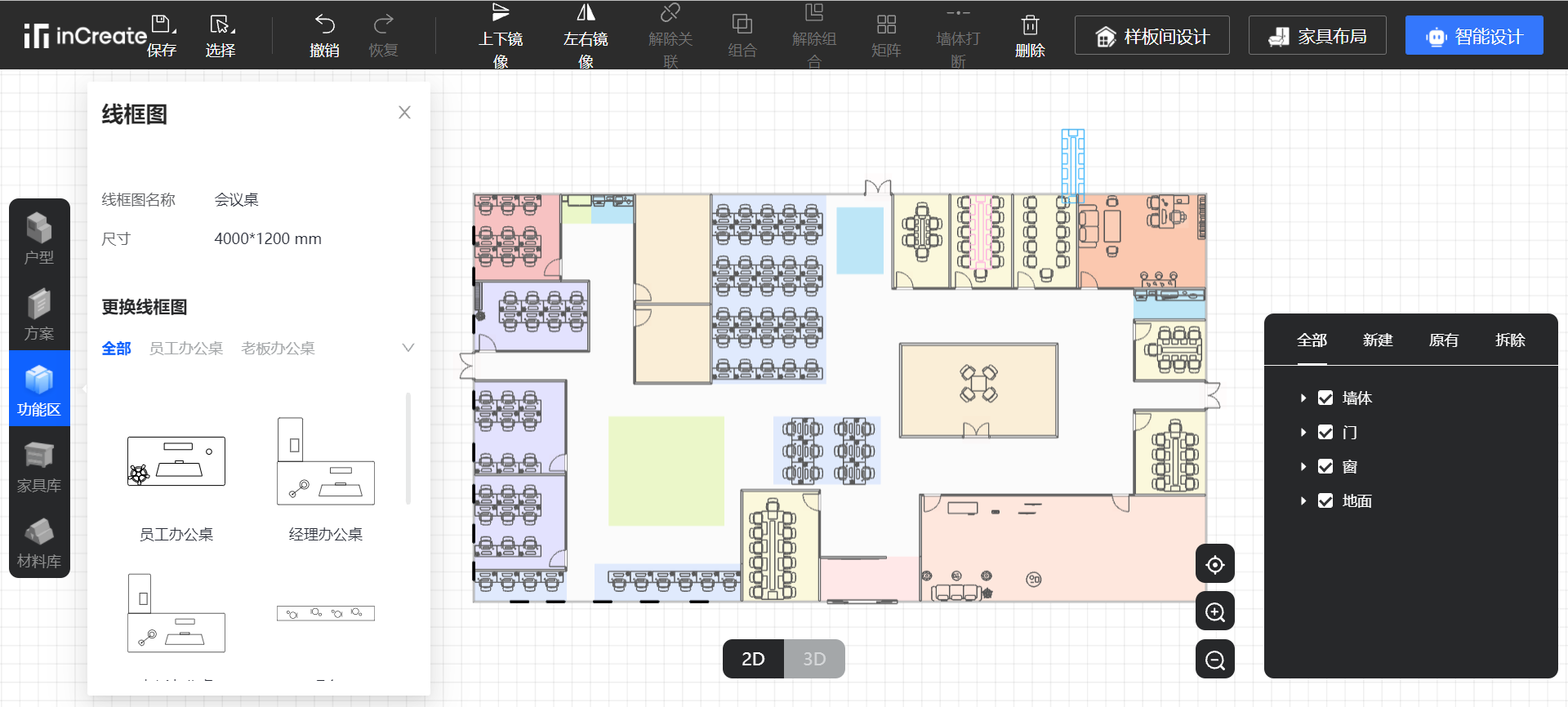 调整某区域空间大小后,「inCreate自图」可根据变化自动适配布局,无论如何调整,面积、功能分区,工位数量、家具位置.....都能保持合理布局,不会顾此失彼。