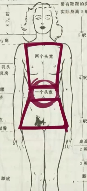 比如人的肩膀一般是3个头的宽度,所以肩膀的宽度就能确定了,但是胸腔呢?胸腔是2个脑袋的高度,而肋骨的下沿与胳膊肘的位置是一样的位置,这里大家可以自己摸一下看看,这时候上臂的长度就出来了,而盆腔的大小位置也是一个脑袋的高度,往下半身的大小宽度再类比一下,人的比例就出来了。