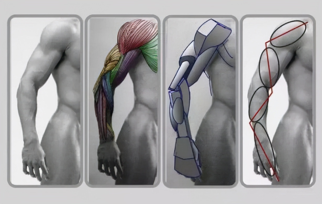 所以建议初学者在练习人体体块的时候可以先把人体的体块做简单化处理,而不是练人体体块一开始就给他上肌肉结构,把各个体块画法理清楚在去做肌肉造型相对容易的多,之后再看伯里曼时理解相对更容易。