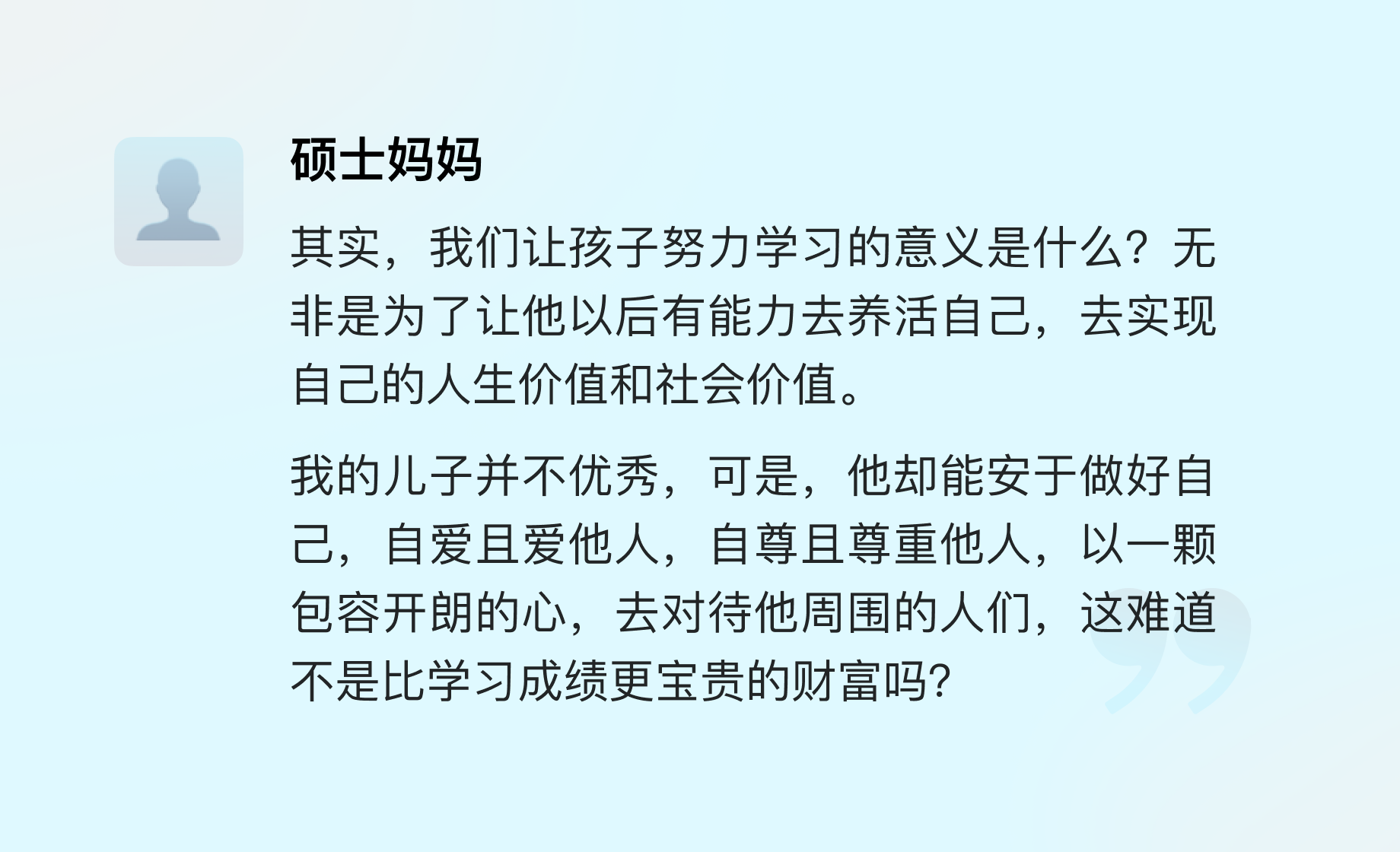 这让我们开始反思,一款教育产品存在的价值究竟是什么?提高成绩的背后,教育的初心是希望他们成为怎样的人?前段时间一位硕士母亲刷屏朋友圈的话让我们感触良多: