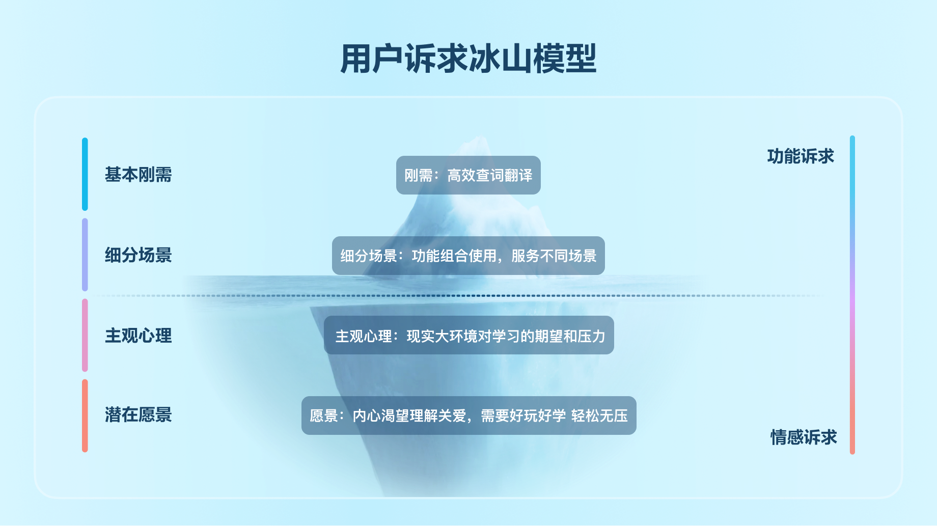 不同年龄段的学习者对学习产品有不同的诉求。近年来,有道翻译官的小初高年龄段用户占比逐渐提升,目前已经超过了 53%,相对有道词典用户更为年轻化。因此,除了满足快捷准确翻译的刚需,我们也尝试探索了学习者背后潜藏的深层需求。
