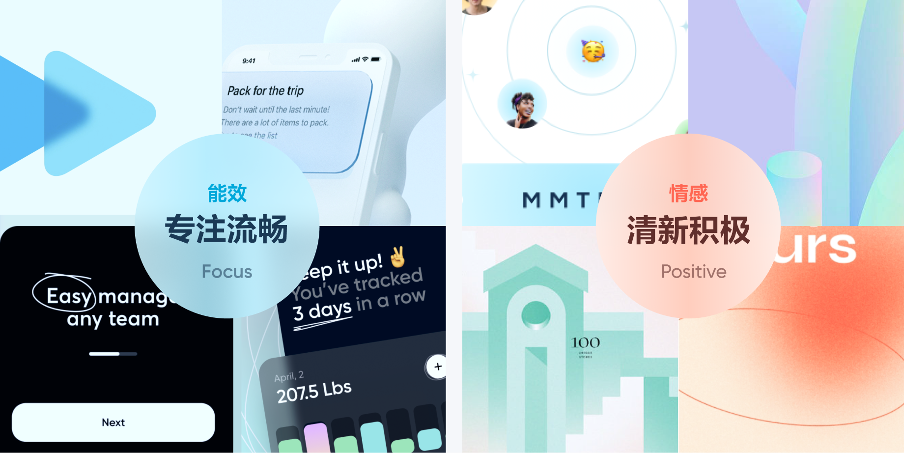 颜色:升级更轻量品牌蓝色,添加轻盈渐变色,创造温和平静的学习氛围;