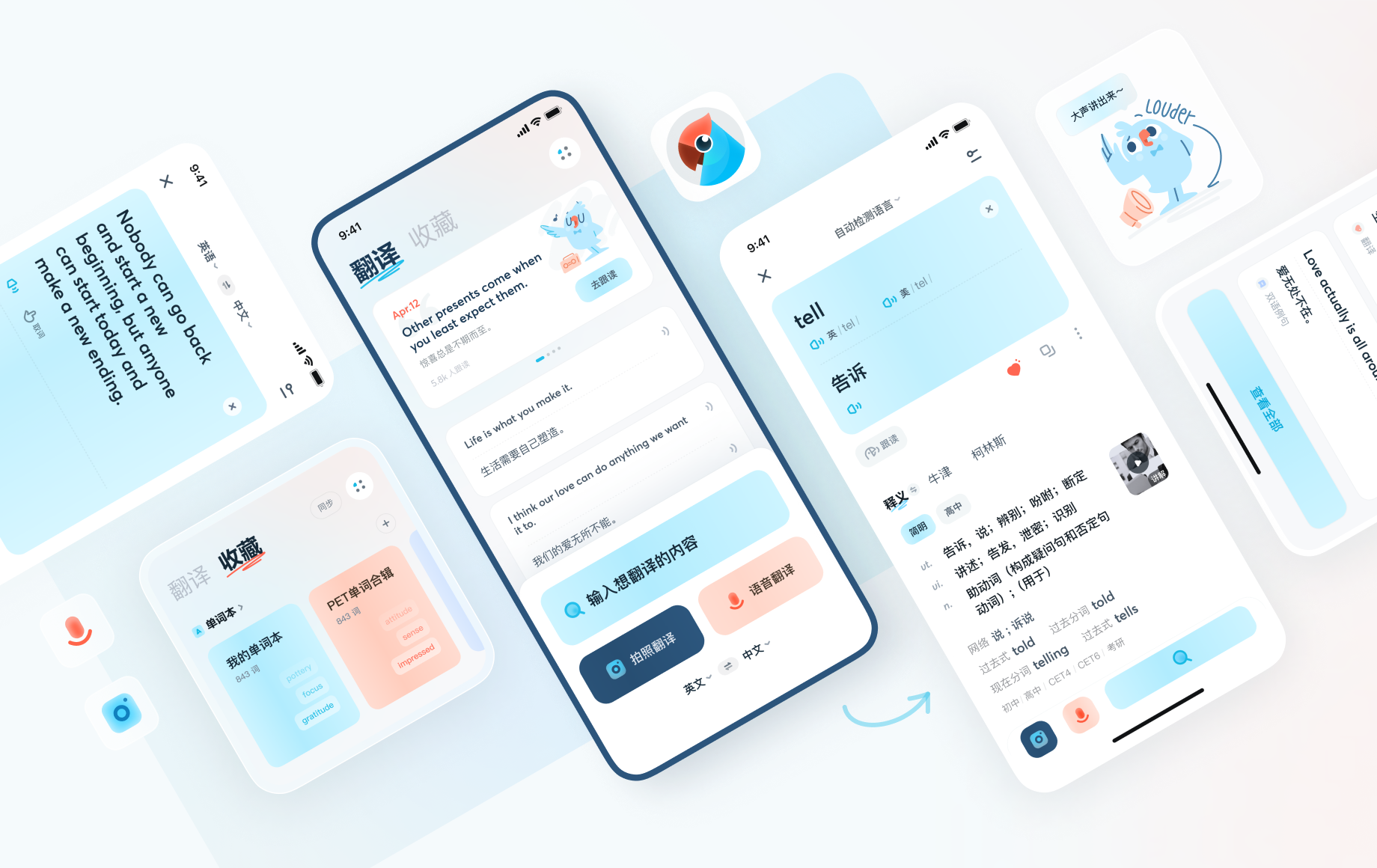 来认识一下翻译官新 IP 吧!新版本升级视频结尾、身份选择页面、首页壹句都有圆滚滚鹦鹉 IP 出现,在用户接触的第一触点增加积极治愈的情绪,传达品牌气质与理念。