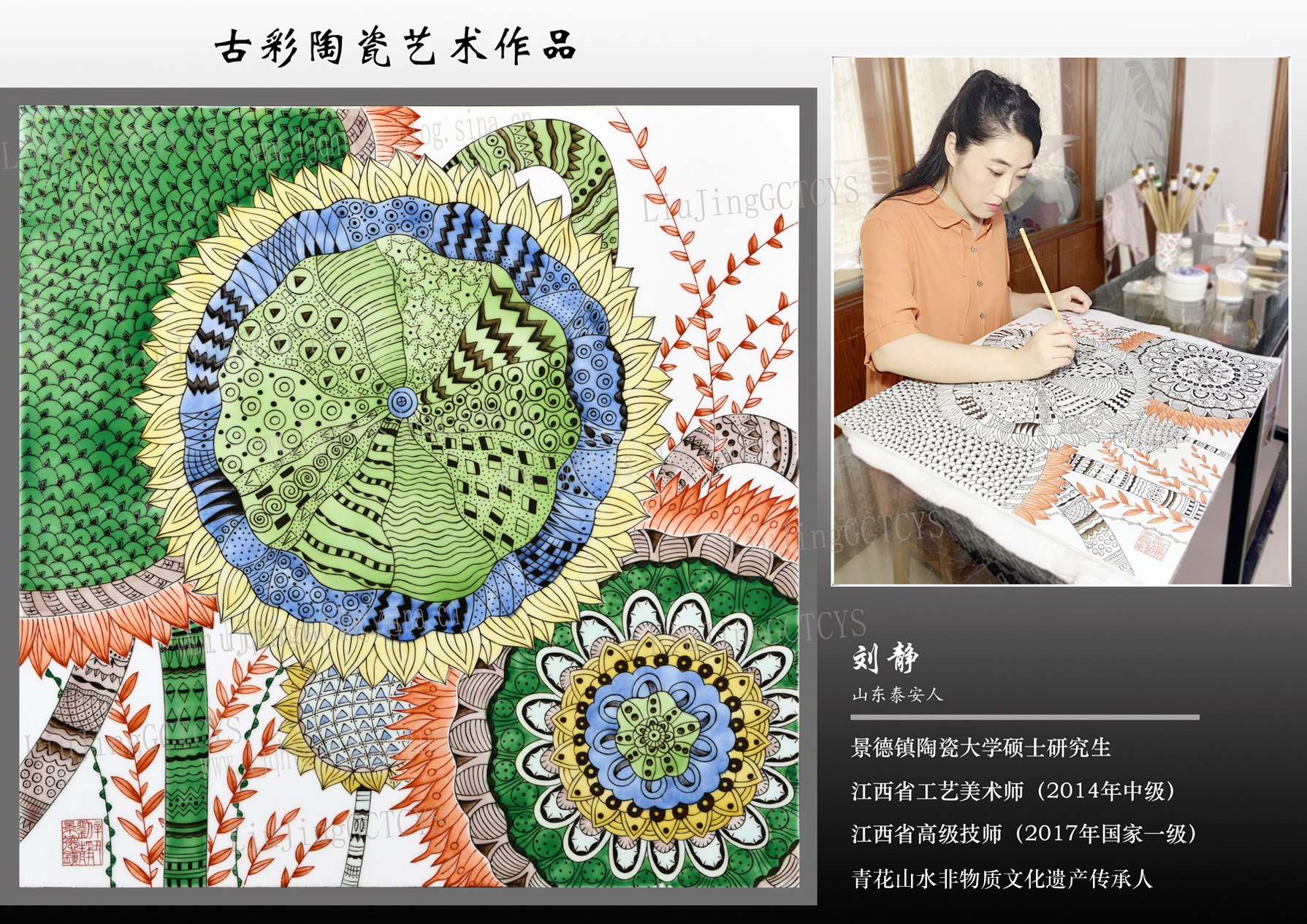 刘静 山东省泰安人,江西省工艺美术师(2014年中级),江西省高级技师(2017年国家一级),青花山水非物质文化遗产传承人。系江西省工艺美术学会会员,中国陶瓷工业协会会员,景德镇中外陶瓷艺术协会常务理事,景德镇市珠山区美术家协会会员。2011年毕业于景德镇陶瓷大学(绘画与陶艺专业),获得硕士学位,师从杨冰教授,研习青花陶瓷绘画艺术,2011年在韩国首尔科学技术大学留学半年,研习陶瓷美术设计专业。毕业后一直在景德镇从事陶瓷艺术创作,陶瓷绘画作品题材以花鸟和山水为主,工艺以青花瓷绘画和古彩陶瓷绘画为主,兼画青花釉里红和釉下五彩,是极具实力和潜力的青年陶瓷艺术家。作品多次荣获国家、省、市级金、银、铜奖等多项奖项,深受国内外业界人士的青睐和收藏。