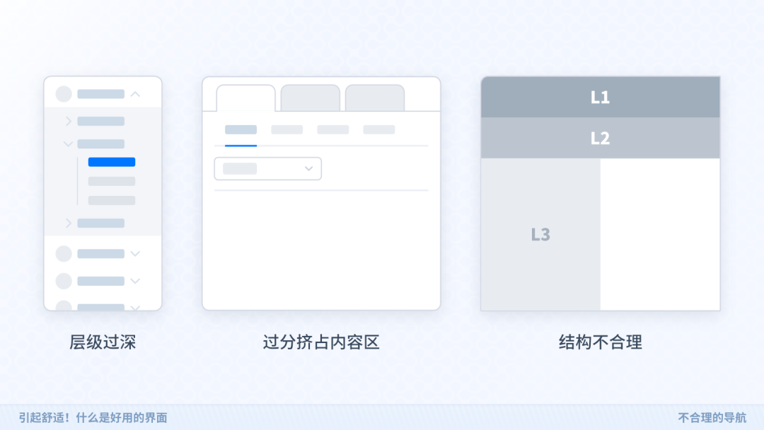 主导航级数过多:视觉样式复杂,操作时需要频繁卷展。 内容区头部导航堆积:用户先看到的不是内容而是导航,浏览效率较低。 横纵导航分配不合理:不合理的结构会影响视线扫描和点选,且空间利用率低。以图中的结构为例,一级导航下不一定都会有二级或三级导航,就会导致页面版式差异过大。
