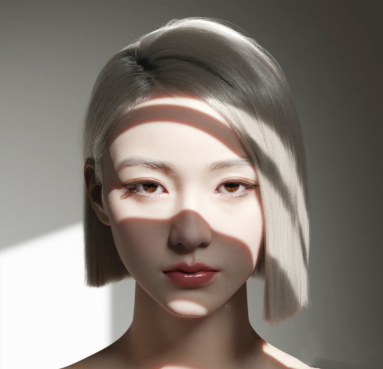 ▲ 外在形象:AYAYI是使用Unreal引擎造出来的特别拟真的Metahuman形象。写实程度更高,人物整体效果已经和真人十分接近,五官特别精致、眼睑微敛、银色短发,散发着一种清冷气质。