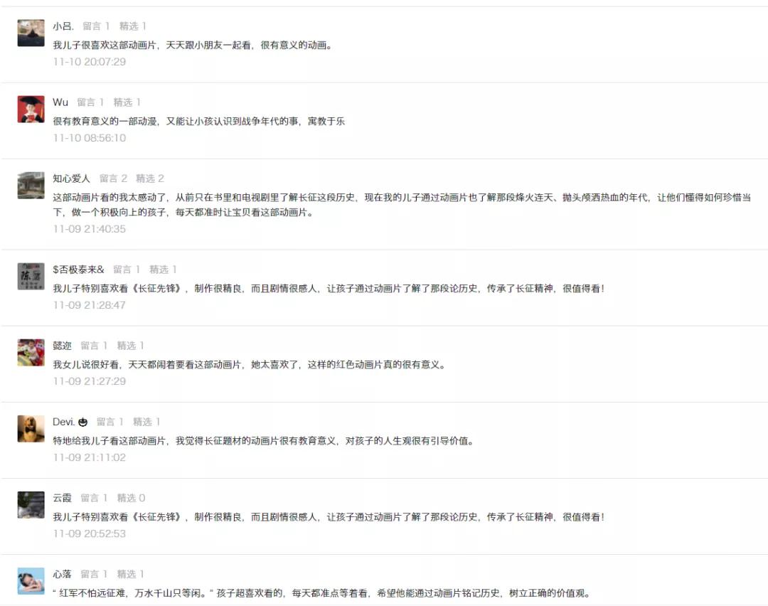 动画片之播出以来,收获了各方人士的认可和好评,许多家长纷纷表示这是一部适合让孩子观看的动画片,可以通过观看《长征先锋》动画片激发孩子的爱国精神,起到情景交融、启思明理的作用。