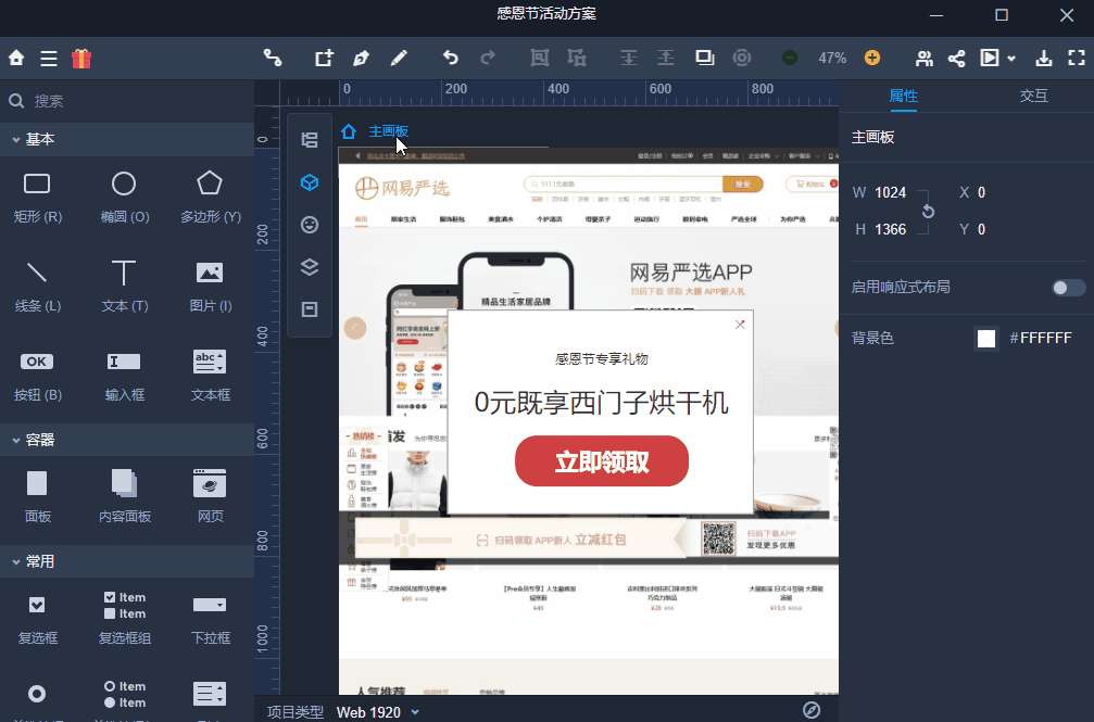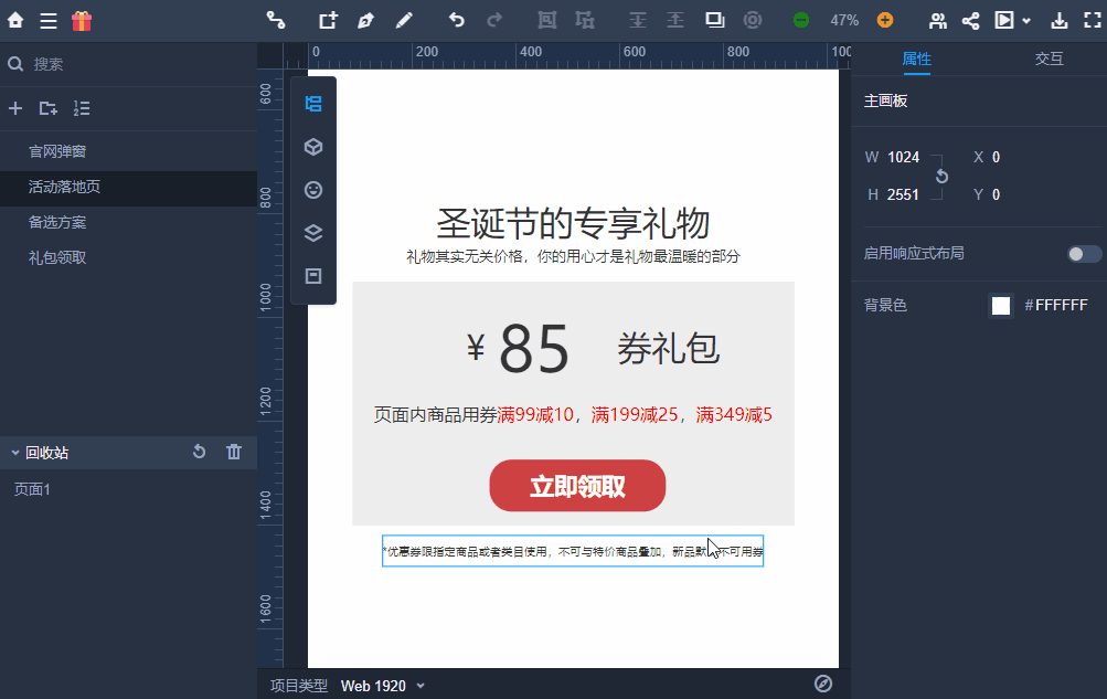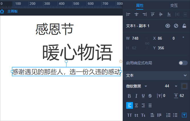 而右侧的属性和交互,则是针对页面中一个具体的元素进行相关的调整。就像页面中的一句文本,若要更改他的字体、大小、间距等,都需要在右侧属性栏进行操作。