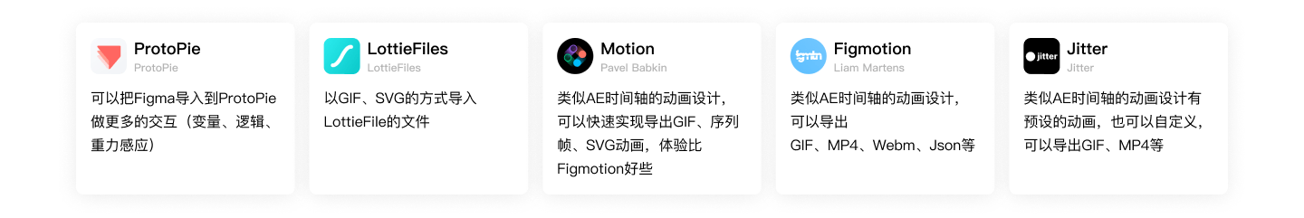 在使用 Figma 之前,可能会由 Photoshop 转向 After Effect、XD 等软件制作动效,如果是 Sketch 流则会有更多的选择可以导入 Principle、Flinto、Protopie、Framer 等工具,Protopie 和 Framer 在动效设计上都是一个不错的选择。