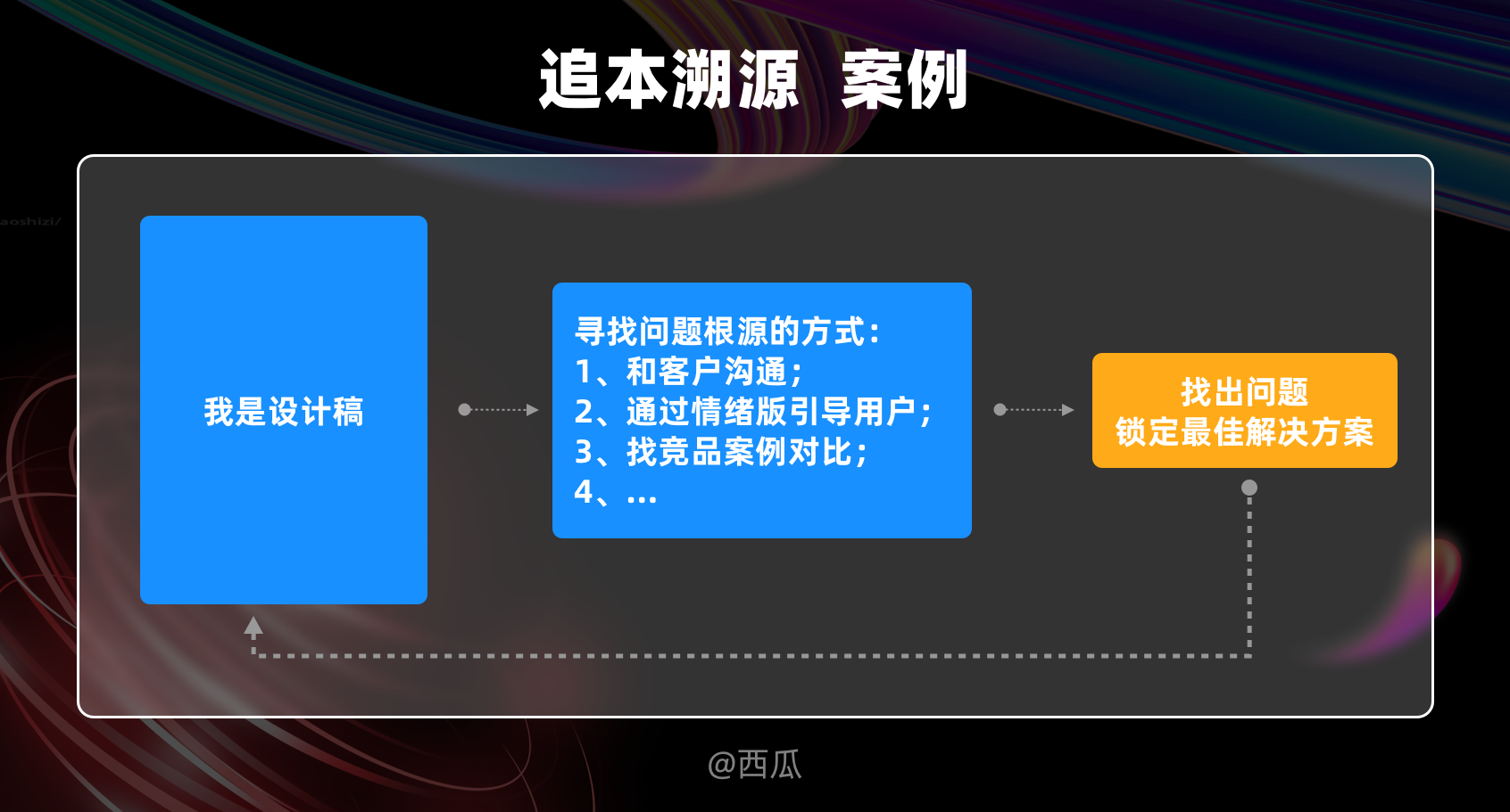 案例二:当你对接客户时,常常交付了设计稿后,客户不是很满意,但作为客户对设计并不了解,他多数只能看到实物才知道是否是自己想要的,这个时候,我们就需要采用“追本溯源”的原则,对已有的结果进行倒叙排查,找出问题根源,然后再运用“第一原则”对发现的问题进行发散思维进行提案。