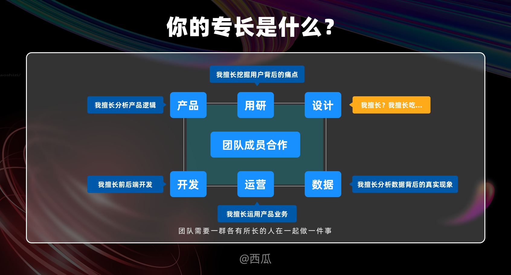 当然了,如果有需要视觉支撑的话,我会直接让视觉同学协助我搞定。毕竟,这不是我的专长,在很多大厂企业,确实都是这样,每个人都需要把自己的长处展现出来,并当作个人人设与标签凸显出来,并为你的团队持续供血。如果说你想提升短板,对不起,你得自己默默升级打怪,团队没时间陪你试错,因为“有成本”!当然如果是你是一个努力的人,你主动和其他同学探讨学习也是绝对没问题的,谁都不可能将所有领域覆盖并精通,所以,大家交流也是对技能的交换。