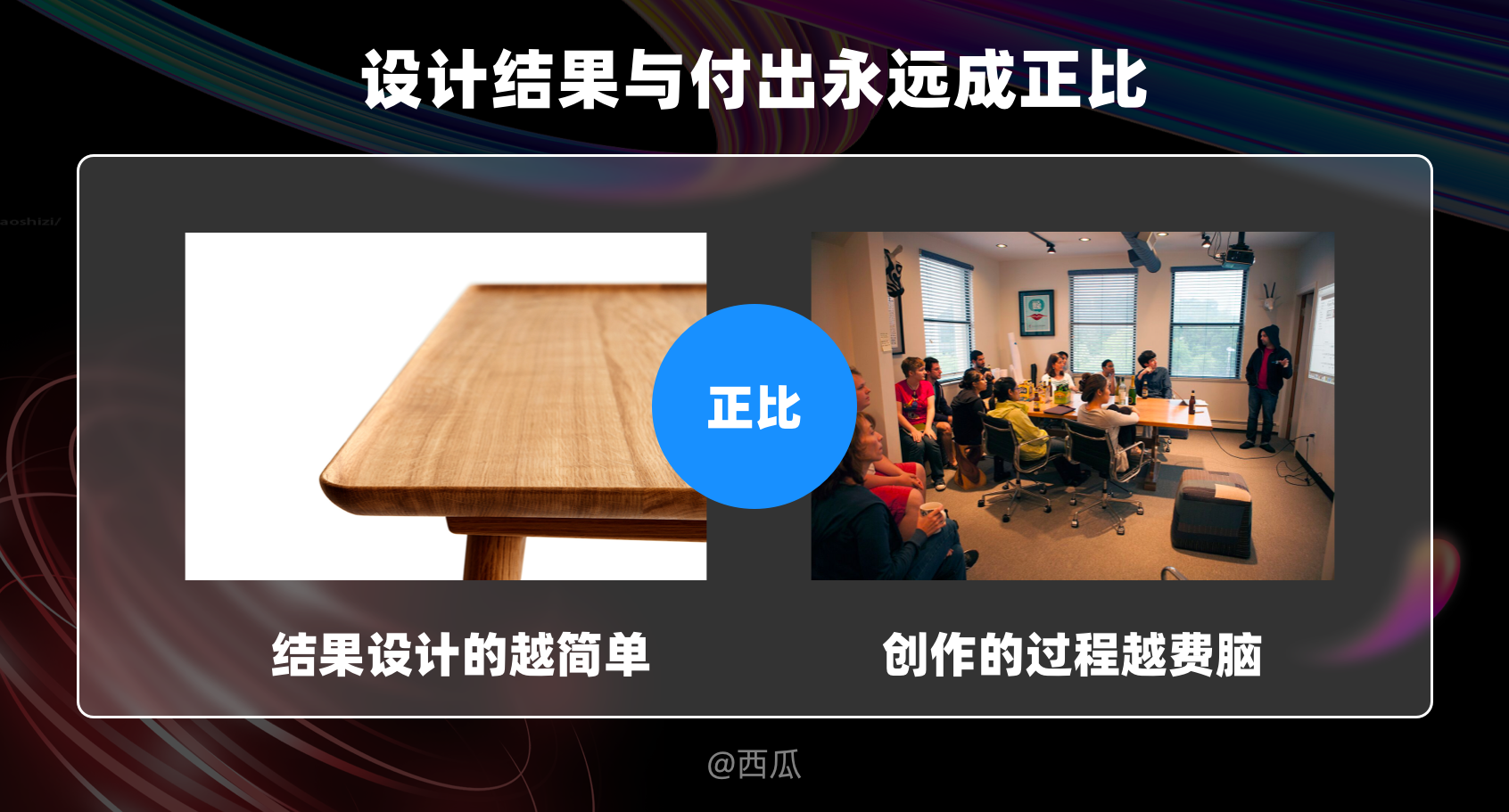 我相信,有的工作本身确实很复杂,但结论并不复杂,可能只是一张纸,或者几段话,或者一个表格就能表达明白。如果你遇到了好用的产品,或看到通俗易懂的教学引导,或者看到了醒目的广告牌,或者读到了简短的报告说明,那么你一定要深入思考一下,它的背后逻辑是有多复杂。你所看到的所有极简设计,背后一定是创造者付出了巨大的努力,试错了很多次,正所谓:越简单,越复杂。