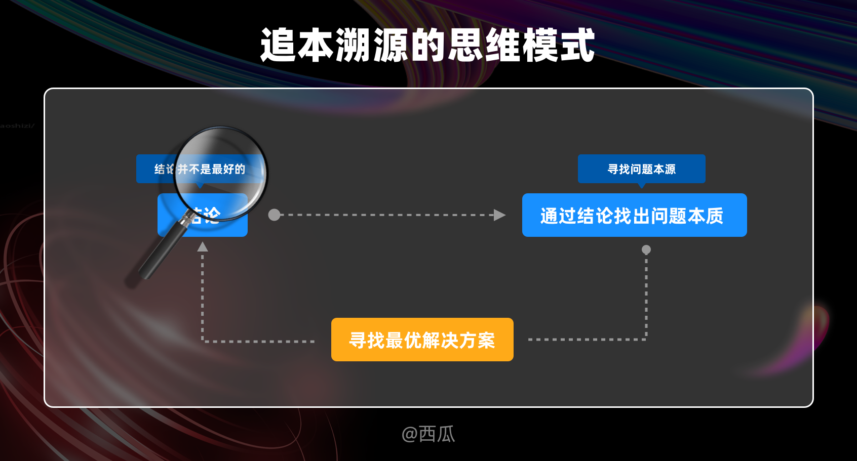这里还需要了解一个原则,它适用于反向推导,名字叫“追本溯源”,“追本溯源”的本质思维属于逆向,和“第一原则”正好相反,“追本溯源”是从表象出发回归本质,而“第一原则”是正向思维,直接从问题出发。那么到底哪个原则好用呢?各有所长,看出在什么场景下,我们举两个例子: