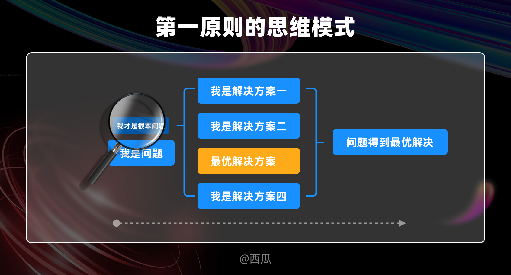 为什么我当时要分享“第一原则”这个概念,因为这个原则能帮助我们解惑“为什么我解决的问题总不在点上?”的问题,第一原则属于正向的思维逻辑,它追崇一切从问题根源出发,并用发散性的思维直击问题如何解决,通过这种思维逻辑,我们能够实现具有创新性的突破,因为一切基于本质推演出的表象有很多种。