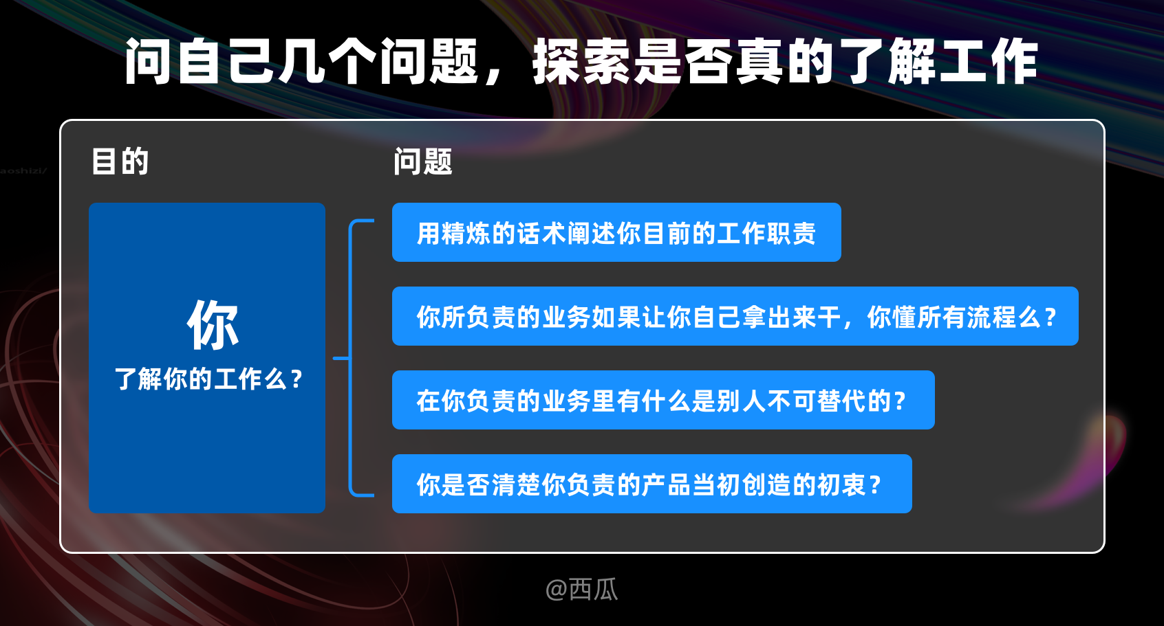 以上这四个问题,可能你阅读后会认为比较简单,也可能已经有一个基础定位,但我希望你能给到一个具体答案时,我想多数人会有一种错觉,就是一看就懂,一答就蒙。为什么会有这种感觉?因为这些问题表象都和你工作有关联,就算我不问它依然存在,但你为什么又回答不出来?因为你从未刨根问底的解决过。