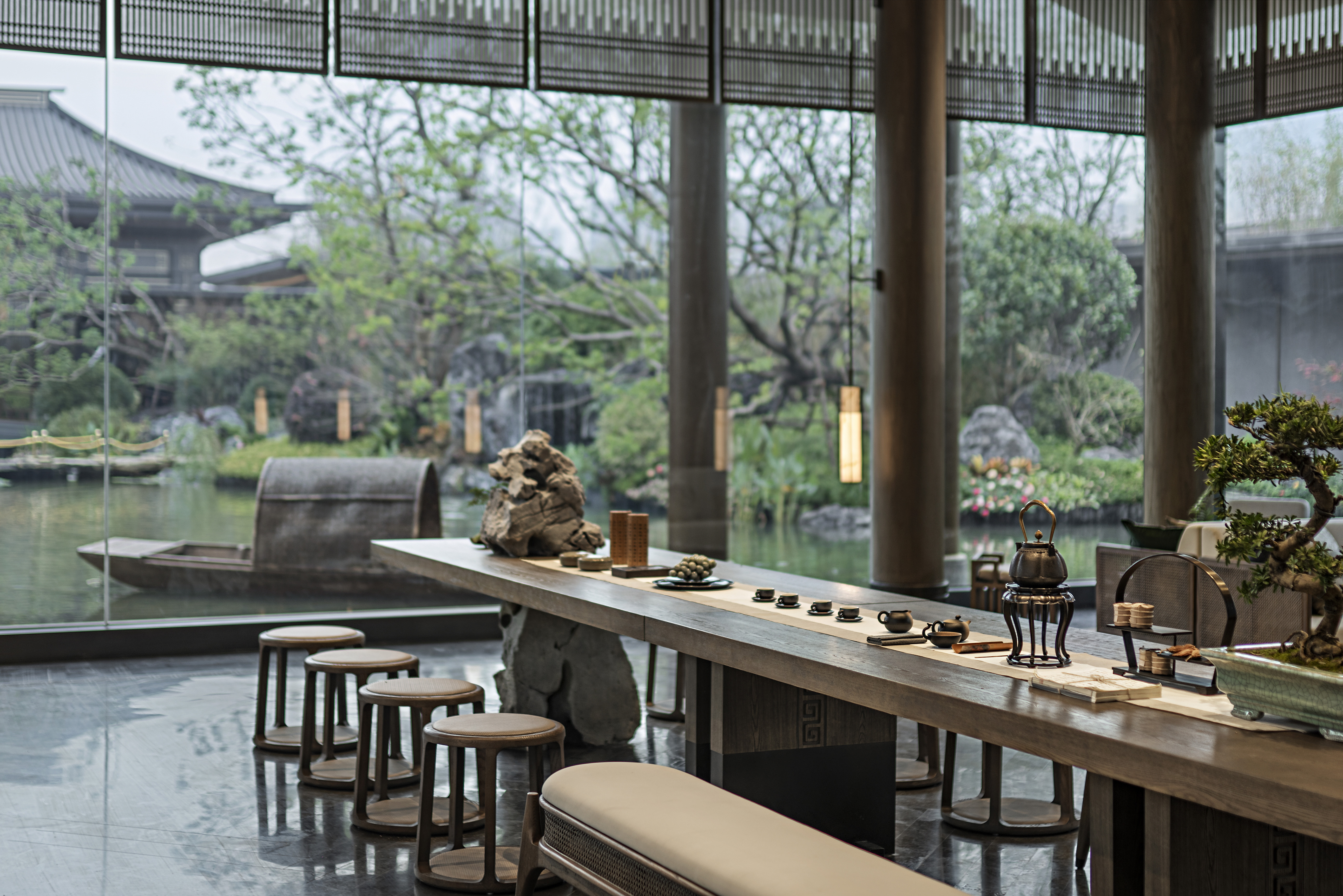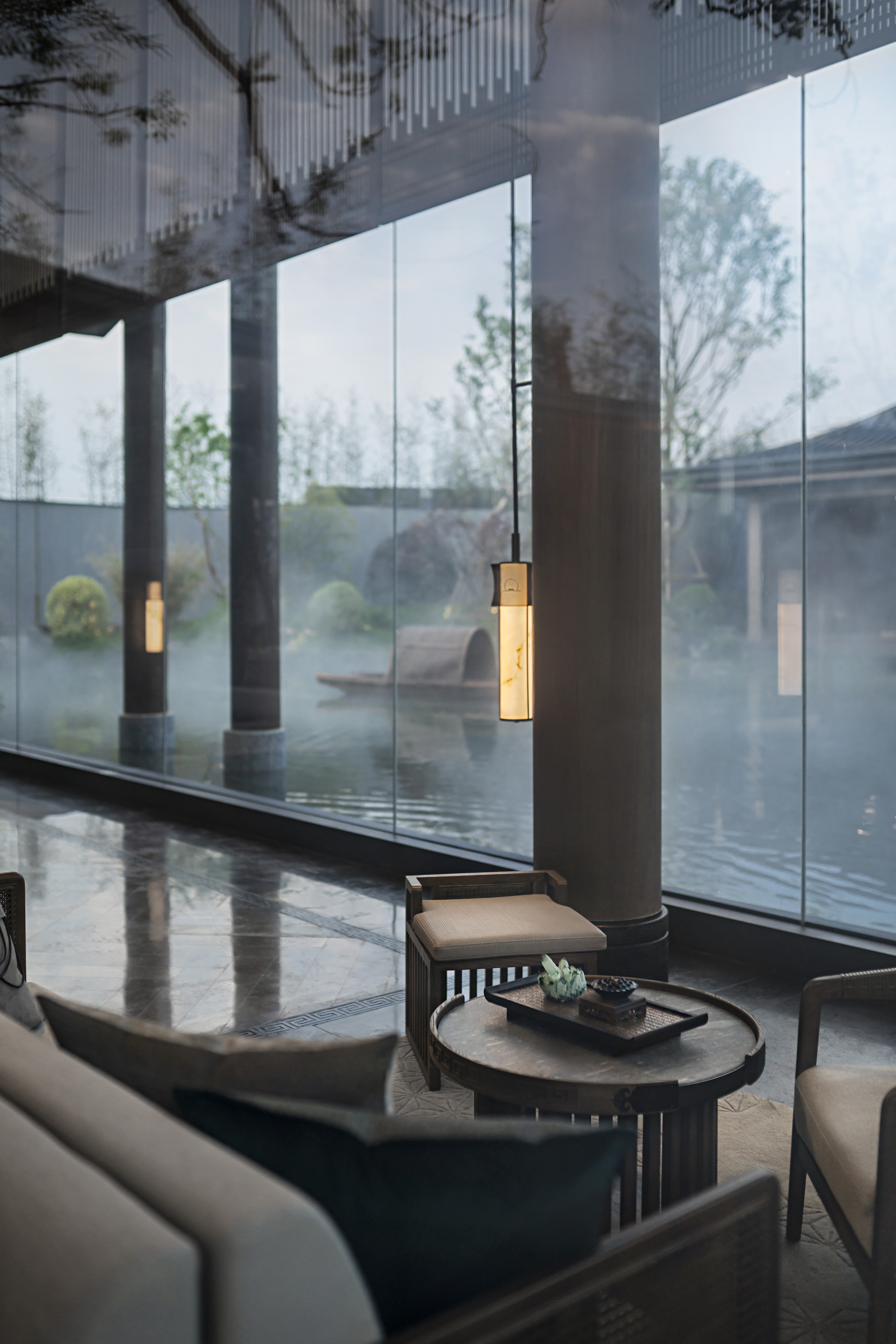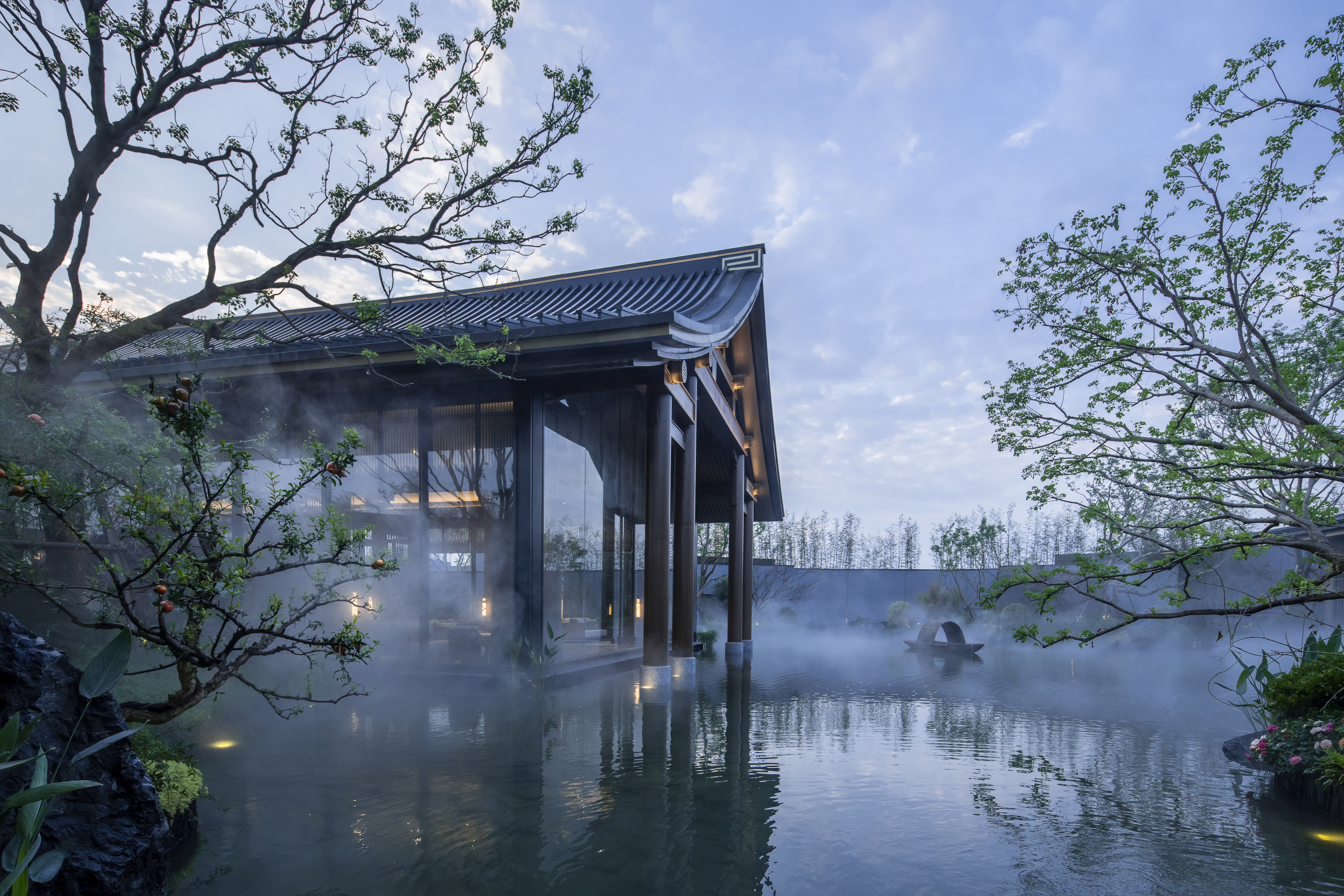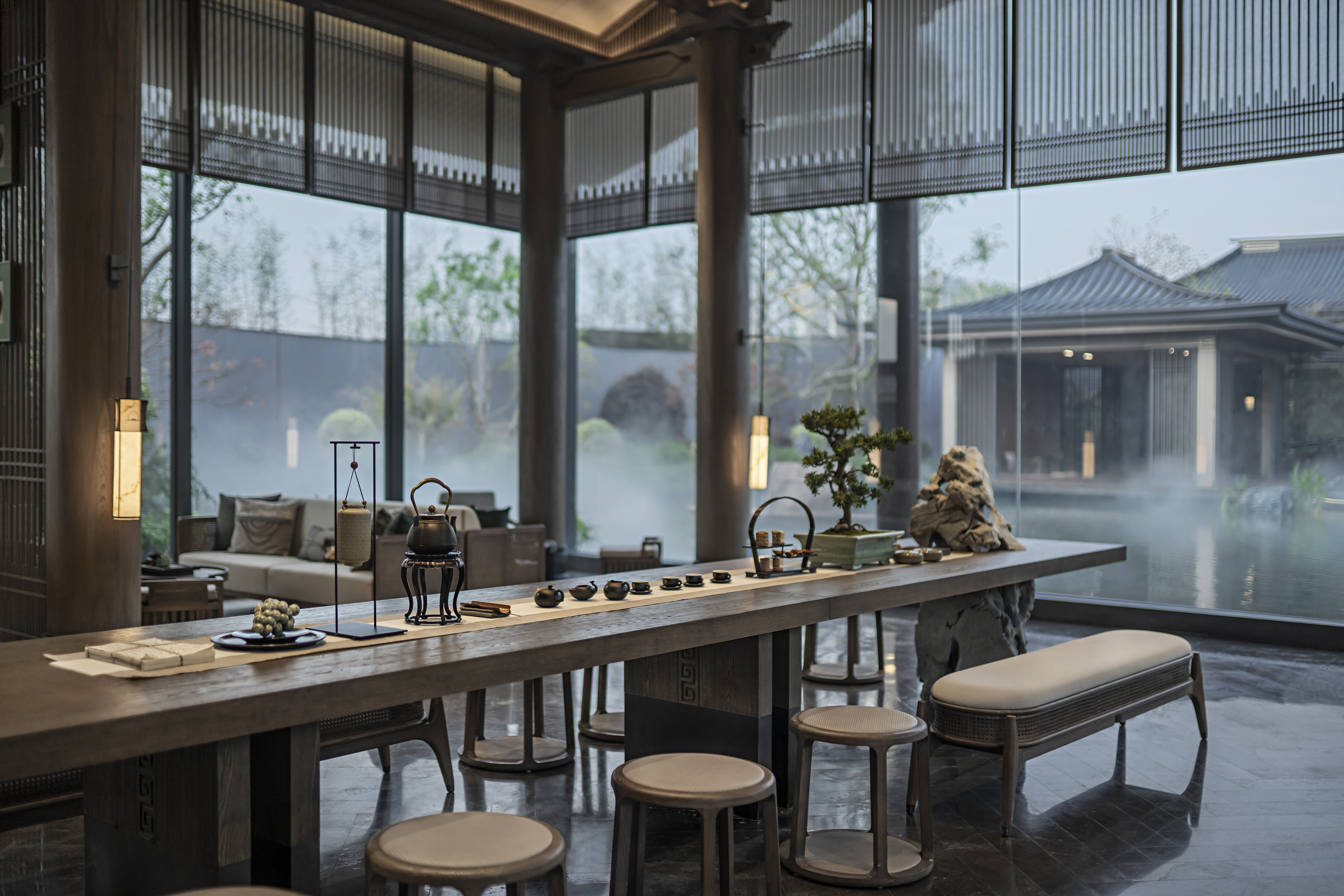 浓雾隐去了尘世中的喧嚣,雾霭掩映处的山水两茫,朦胧氤氲,模糊了室内外的边界,这四方围合的有限空间也开始无限延伸开去,与自然、与人文一同有机生长着。