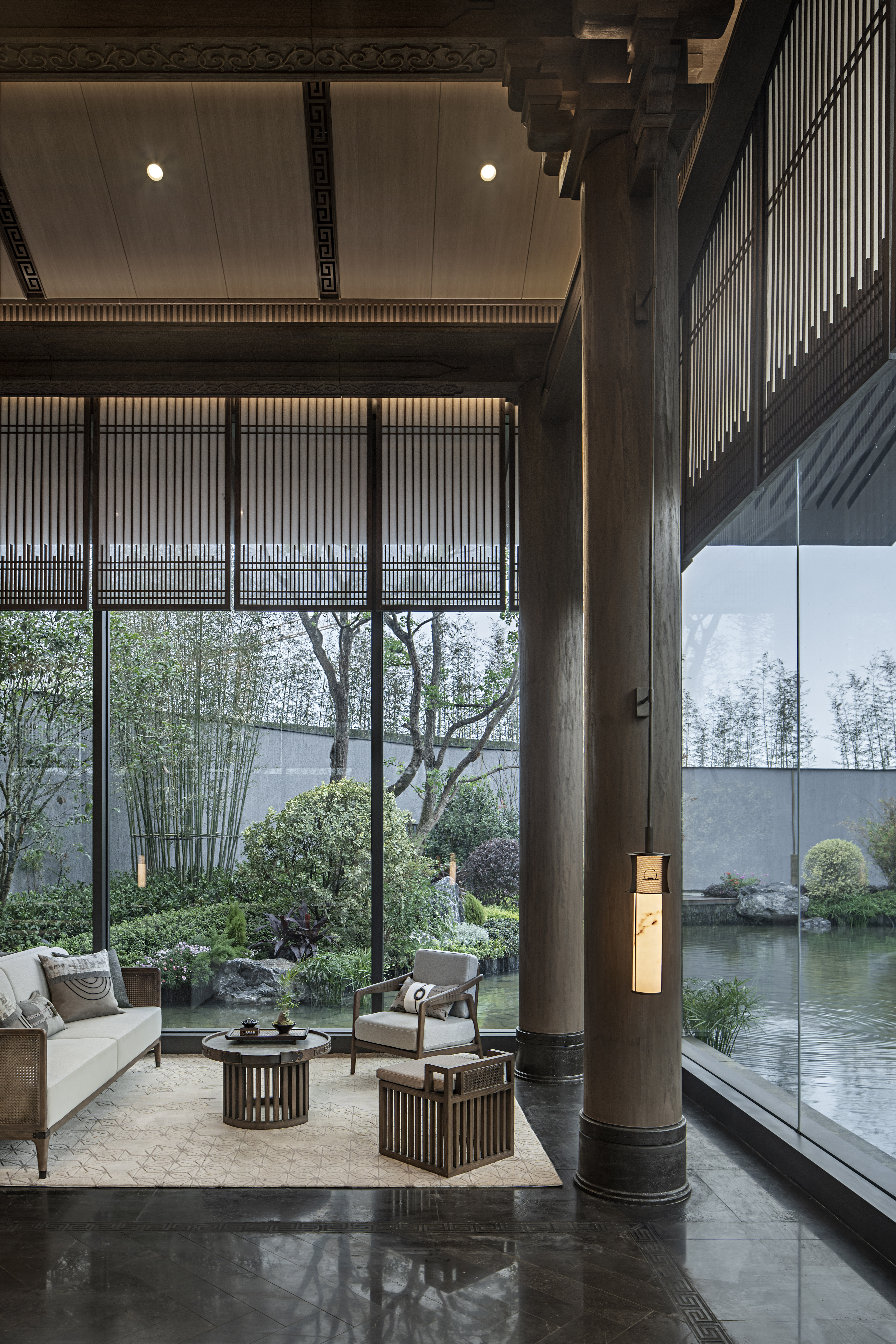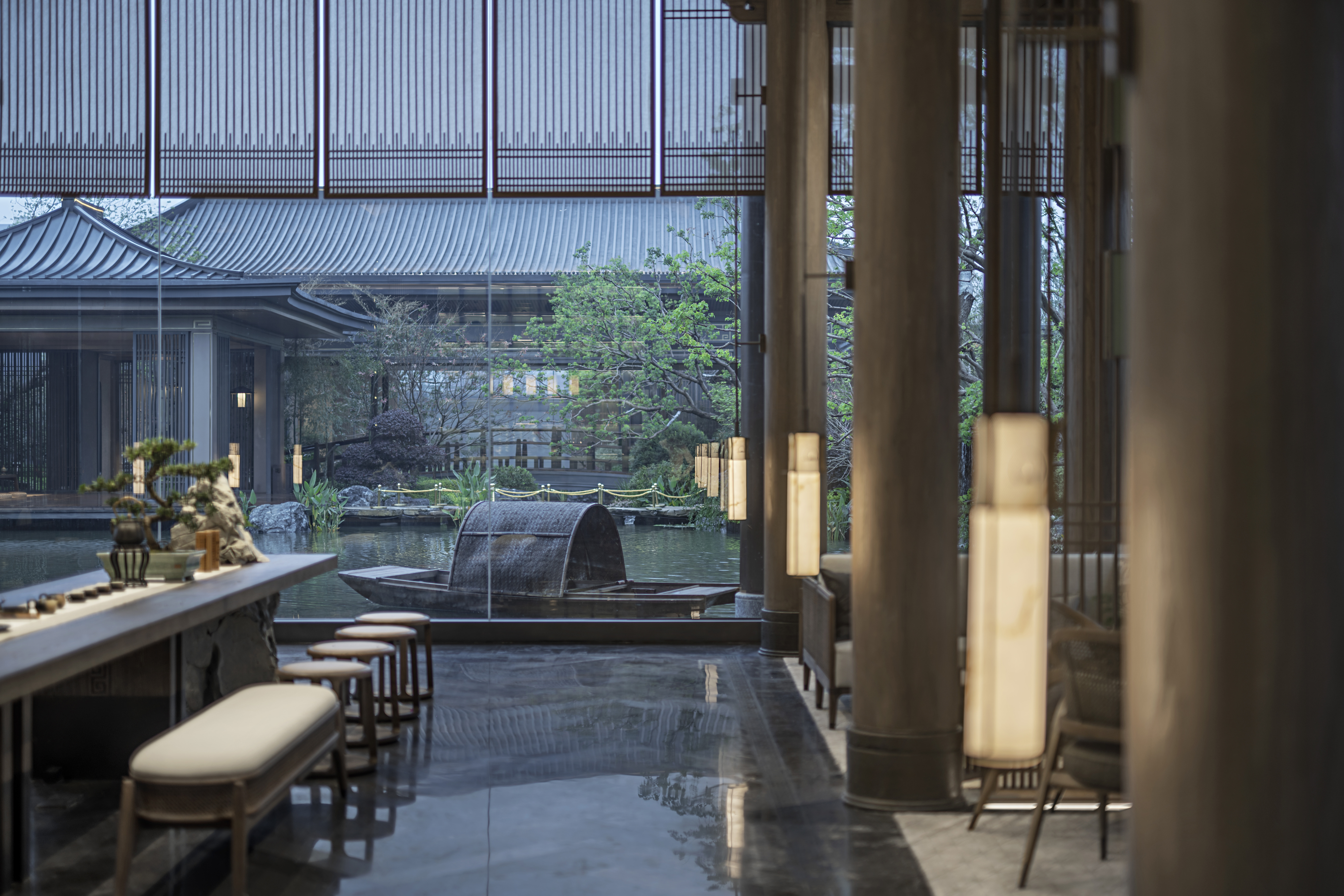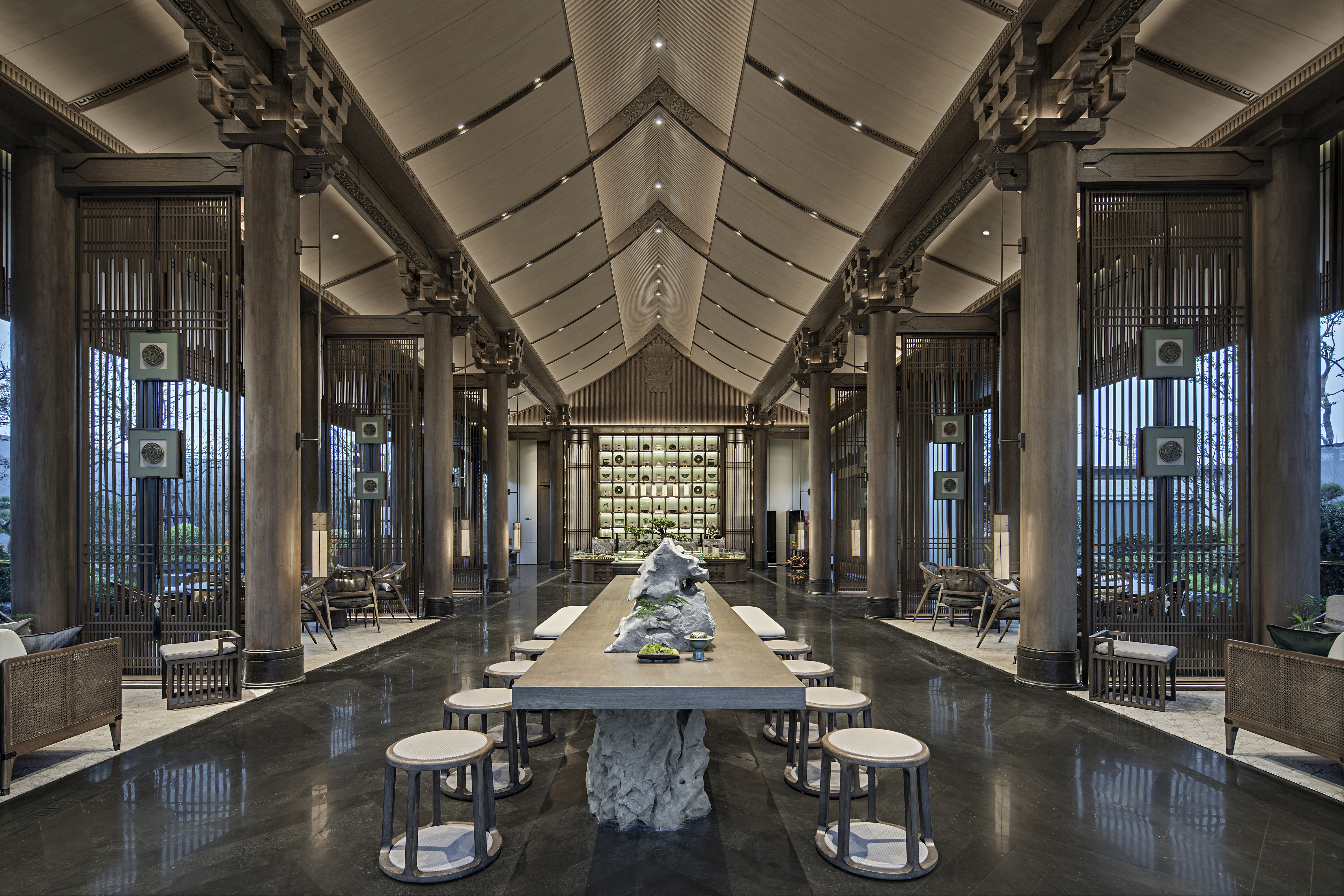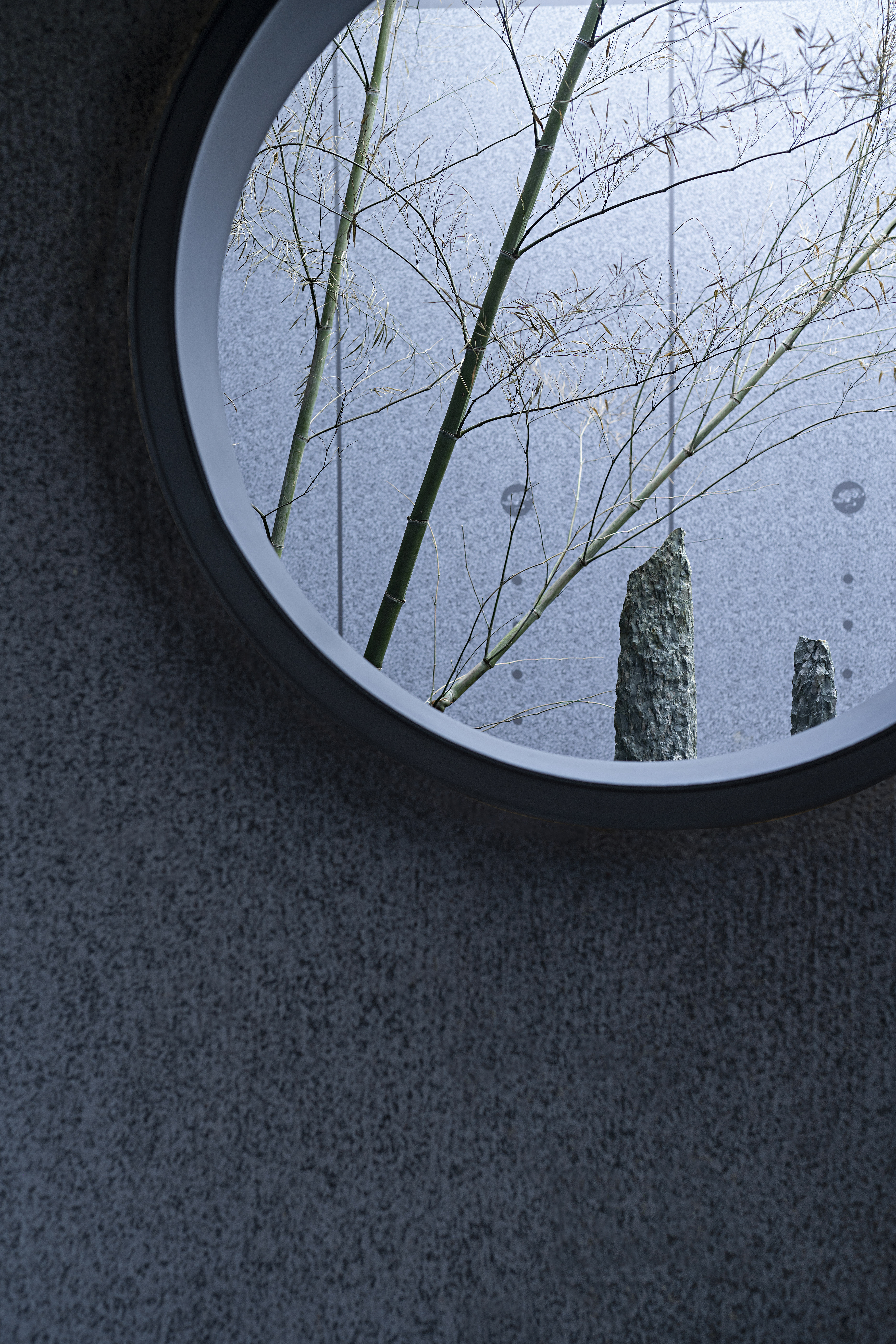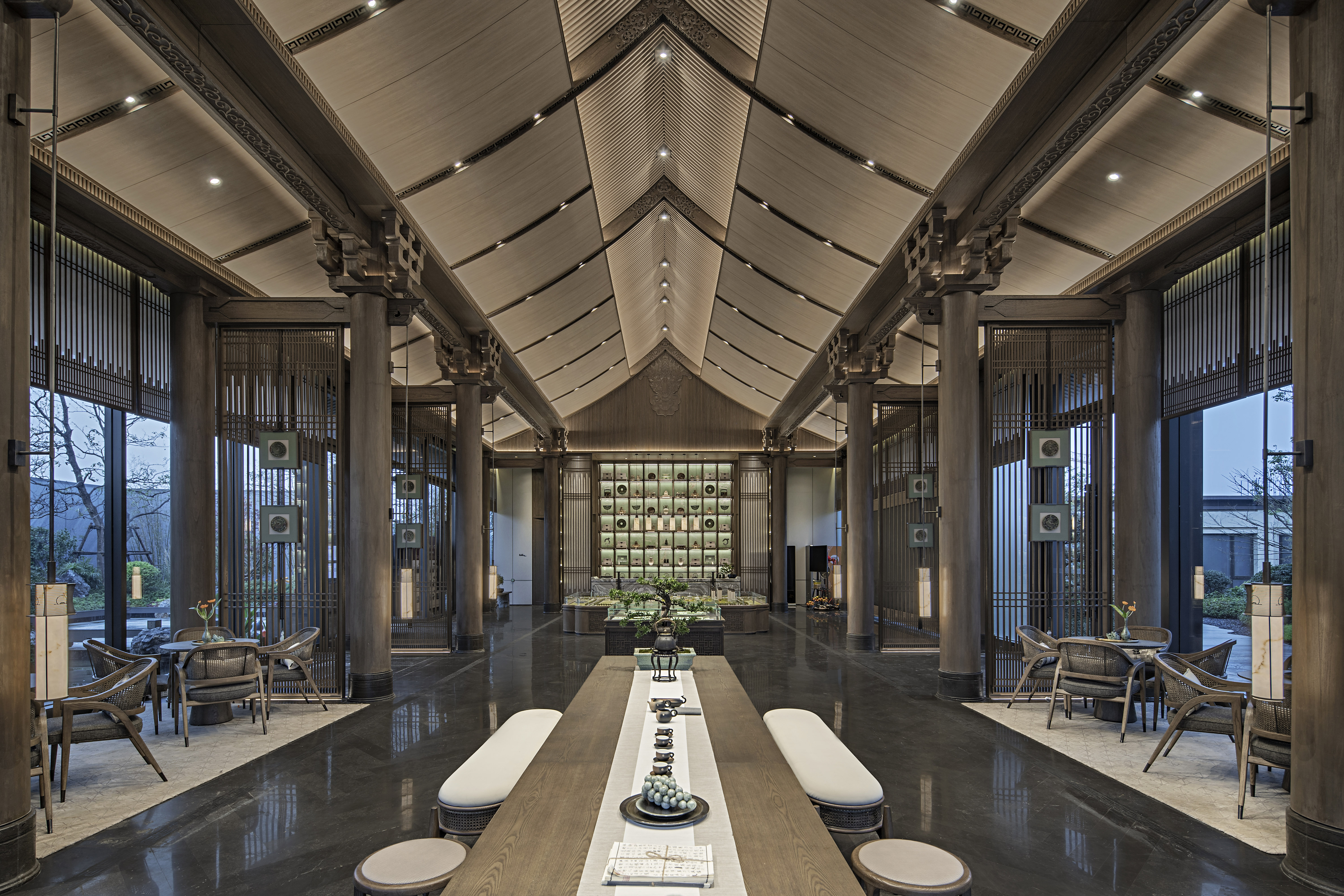 浓雾隐去了尘世中的喧嚣,雾霭掩映处的山水两茫,朦胧氤氲,模糊了室内外的边界,这四方围合的有限空间也开始无限延伸开去,与自然、与人文一同有机生长着。