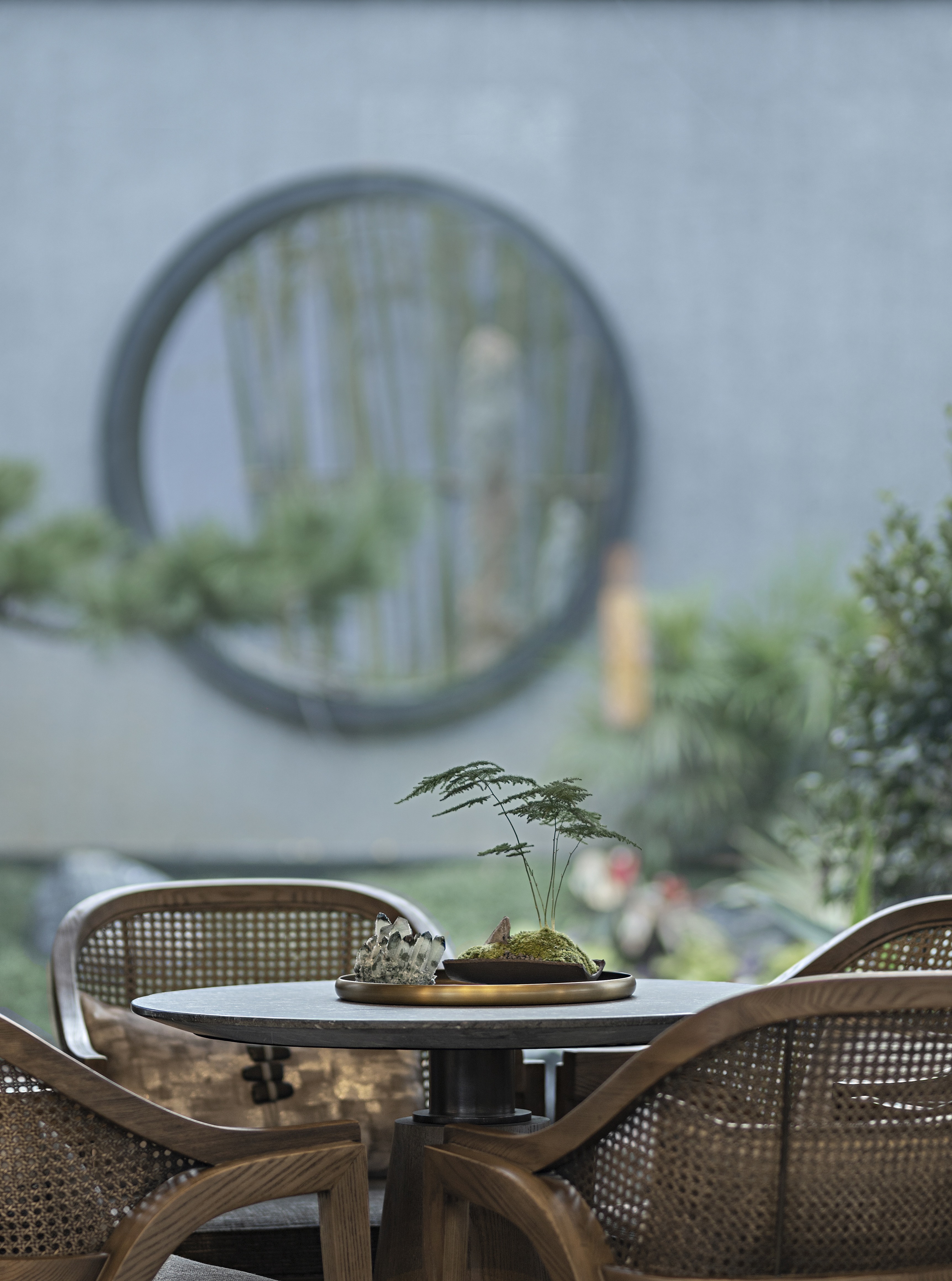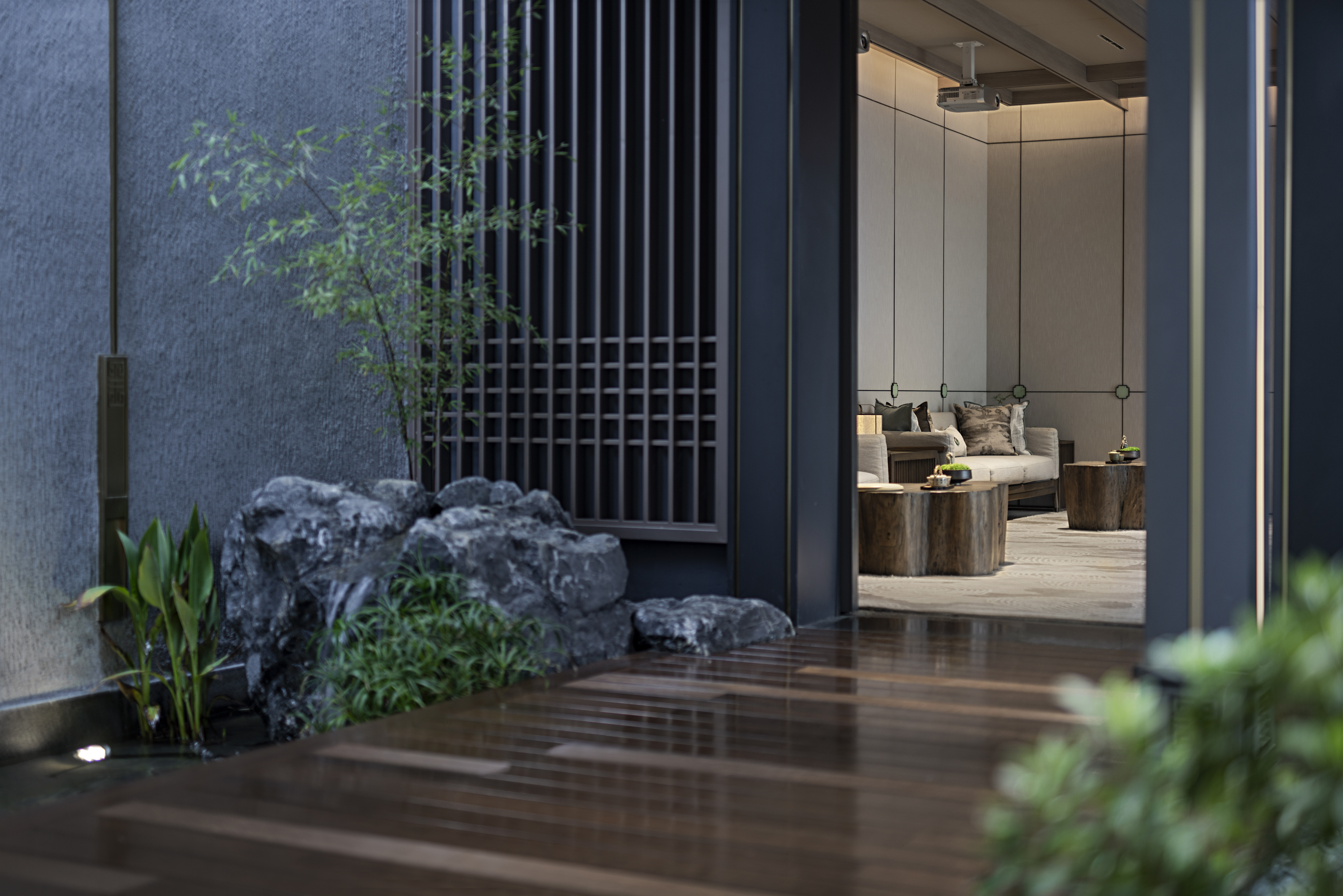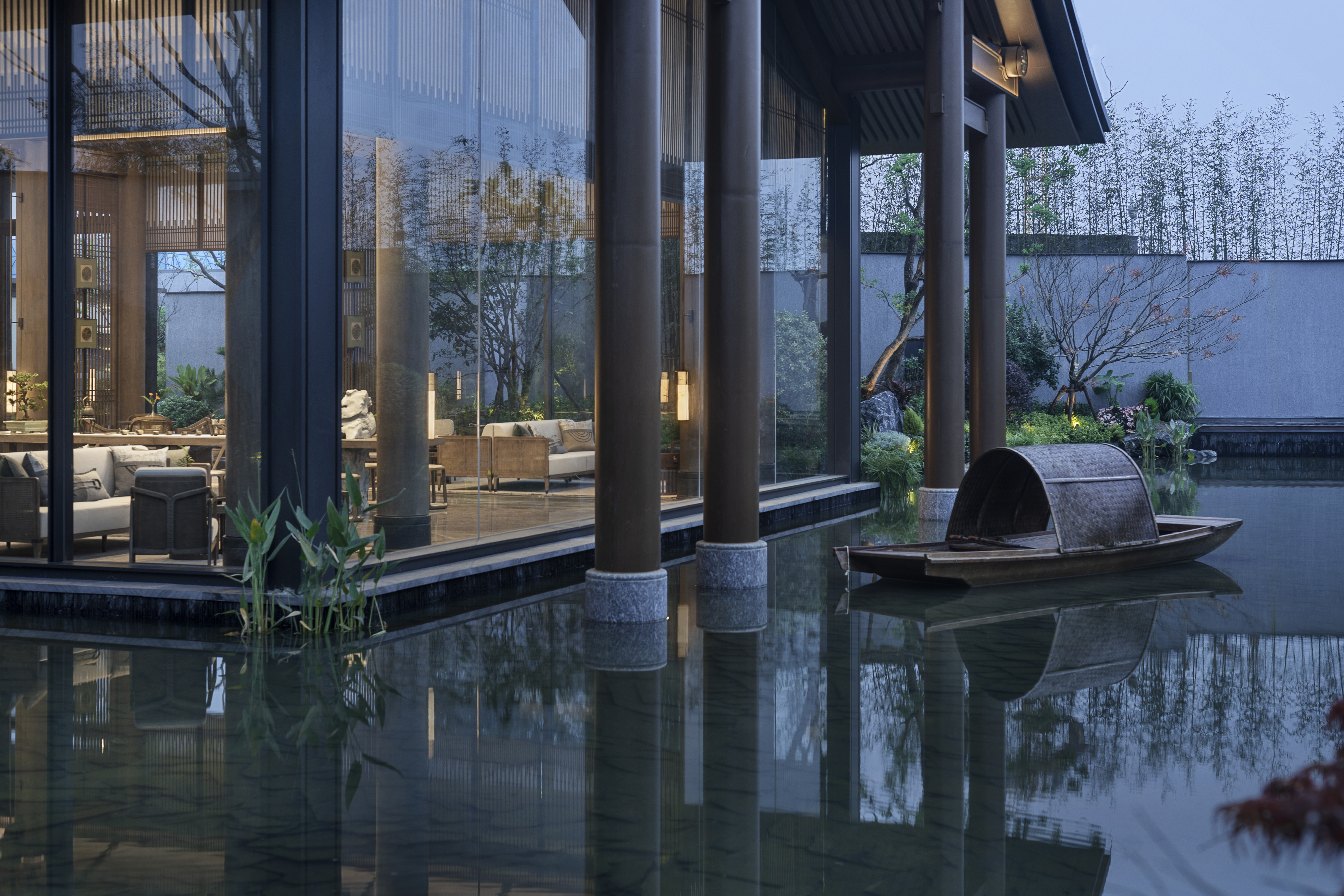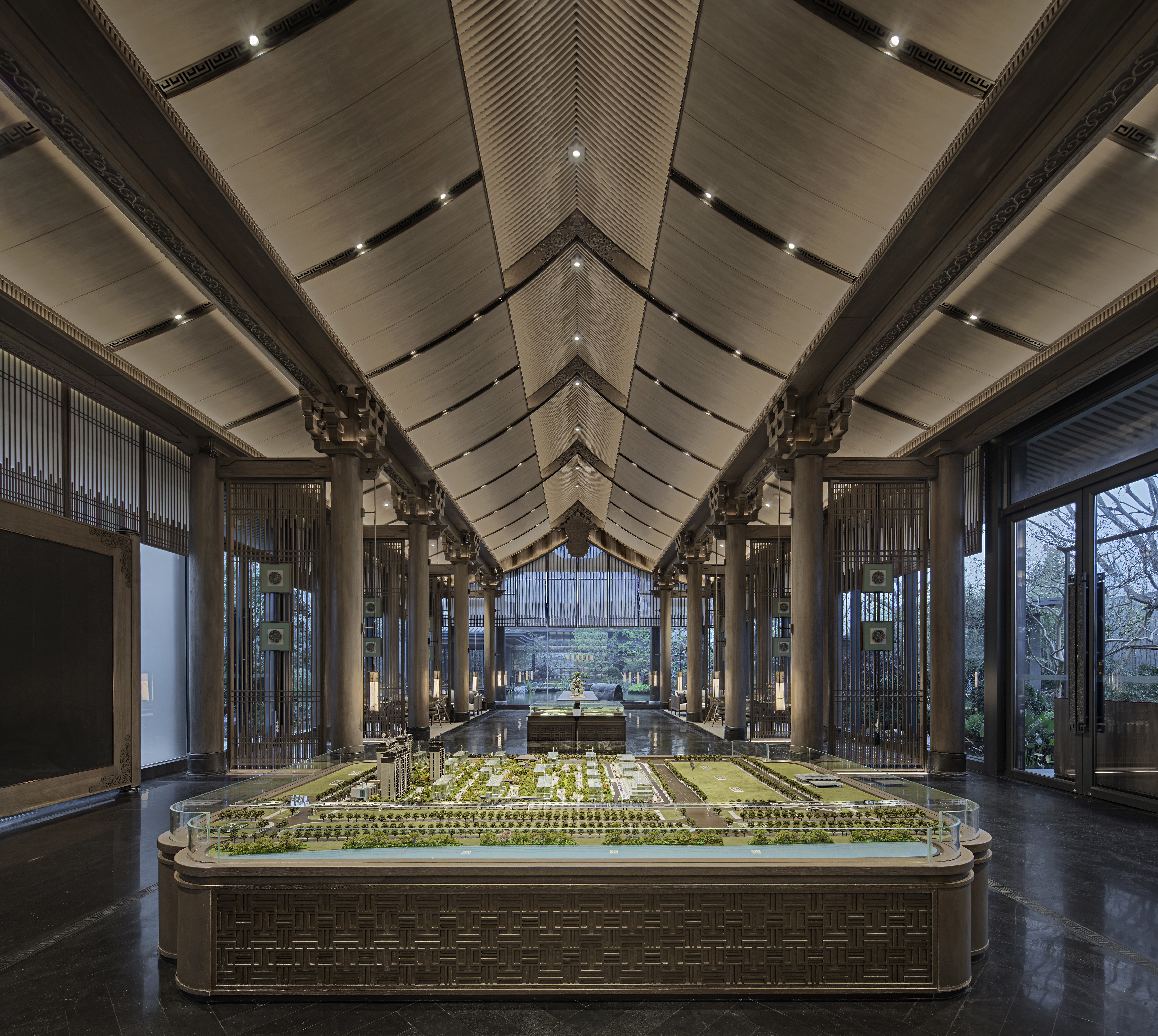 浓雾隐去了尘世中的喧嚣,雾霭掩映处的山水两茫,朦胧氤氲,模糊了室内外的边界,这四方围合的有限空间也开始无限延伸开去,与自然、与人文一同有机生长着。