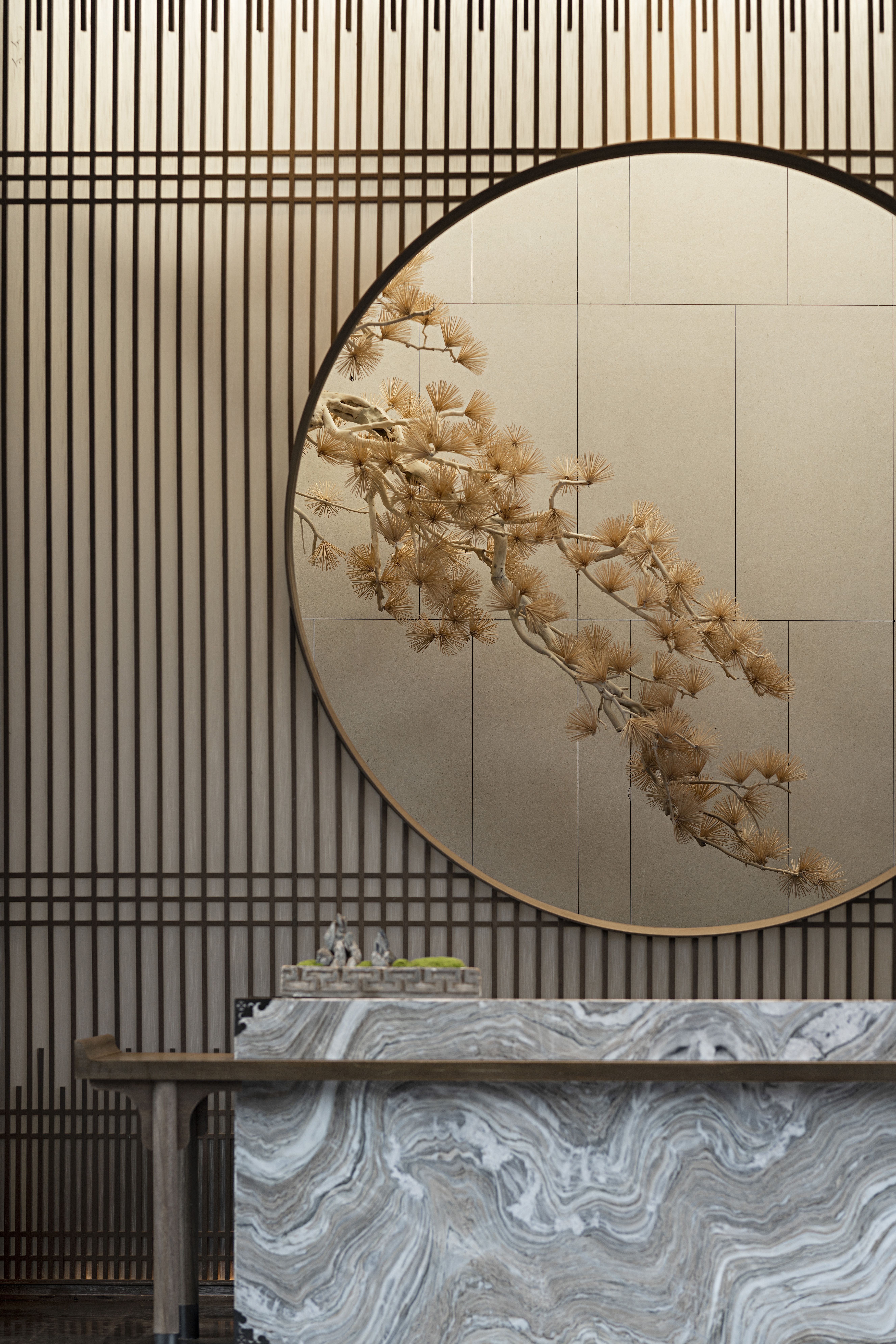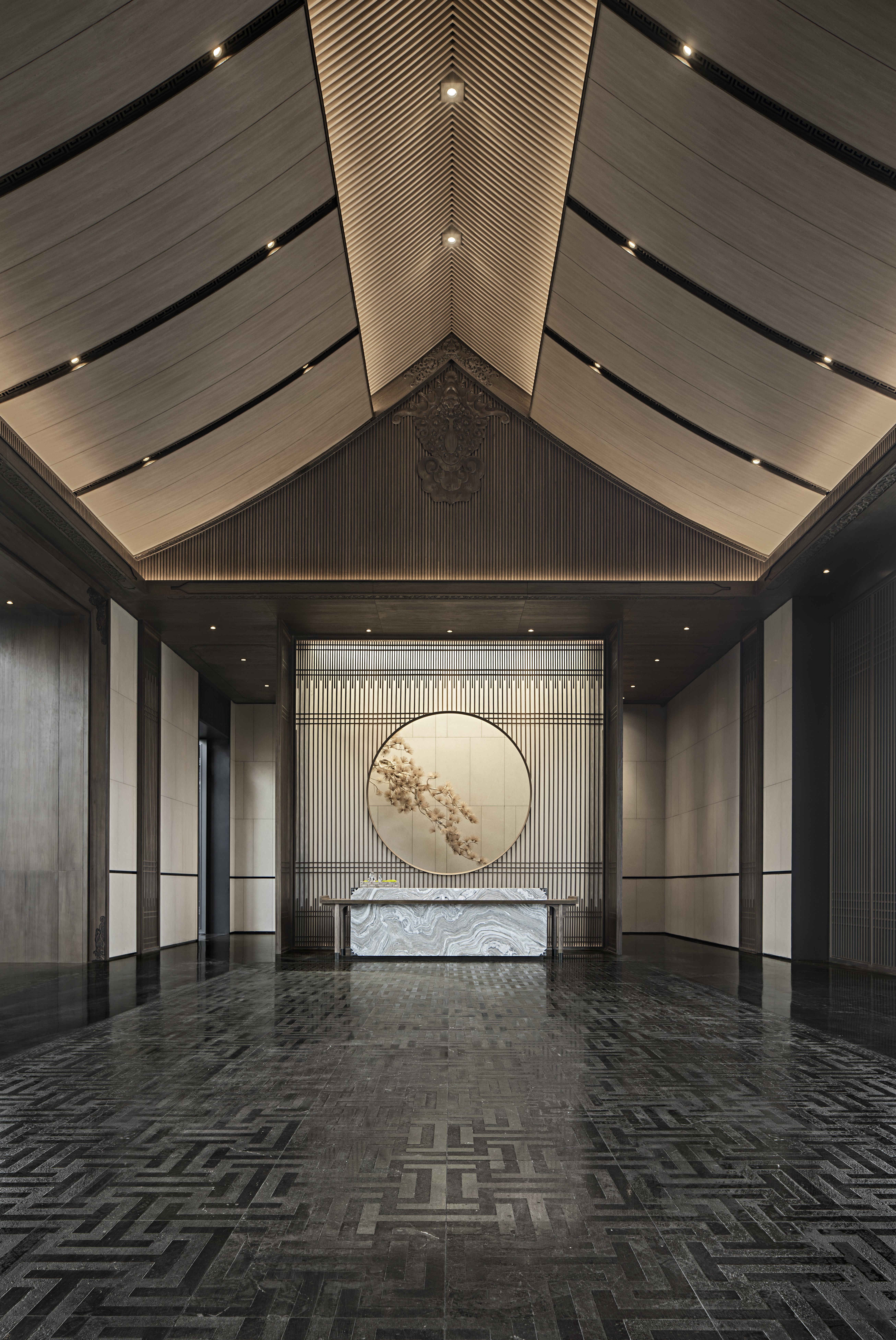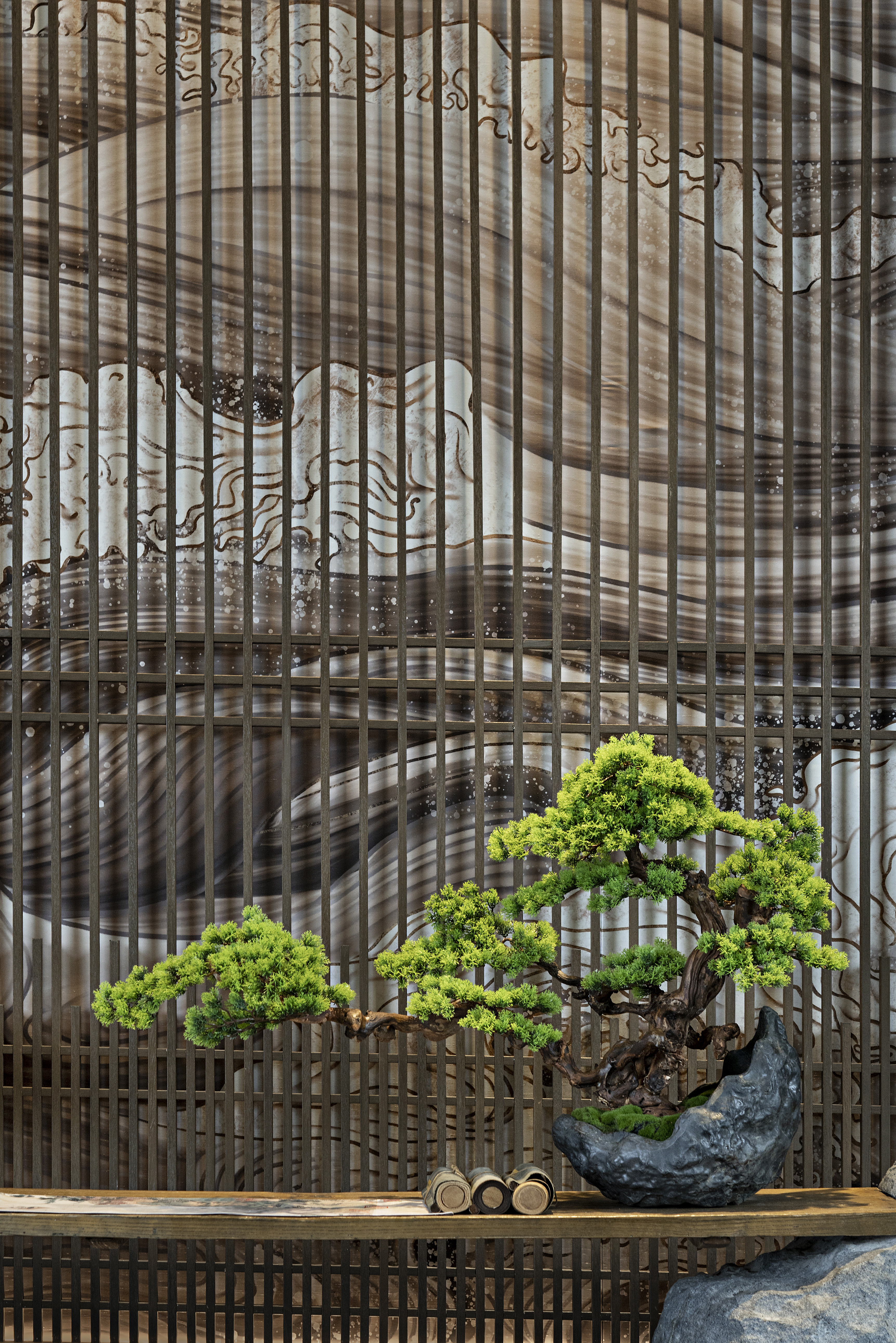 项目整体取意于宋人马远的《松阁观潮图》。画中古人于湖心亭间观潮赏景的隐世般的生活体验和心灵感受,以及人与自然的关系,启发了设计师对建发玖洲和玺项目的设计思考。