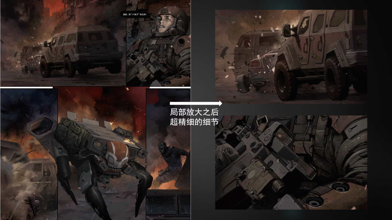 第一次看矩阵老师的《红日》时,真的非常惊讶!漫画居然可以画的这么细,以至于在电脑上放大很多倍去看,作品中的细节仍能保持得十分清晰。基于这个原因,在讨论成书尺寸时,数艺君觉得用传统漫画或设定集的开本,完全无法体现这部作品的精髓。