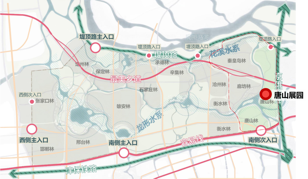 唐山展园位于雄安新区起步区南北中轴线上,属于雄安郊野公园东部展区的十四大展园之一,唐山展园东侧紧邻京雄高速,西邻郊野公园一级园路,占地面积约45.7亩。项目重点研究唐山发展历史、工业成就、地域文化等城市人文及唐山特色乡土植被,以“英雄城市,绿色唐山”为主题定位,结合植物配置、水系及地形营造、本土材料等多要素的景观形式,全方位诠释唐山的城市精神,立体化展示生态文明建设的成就 。