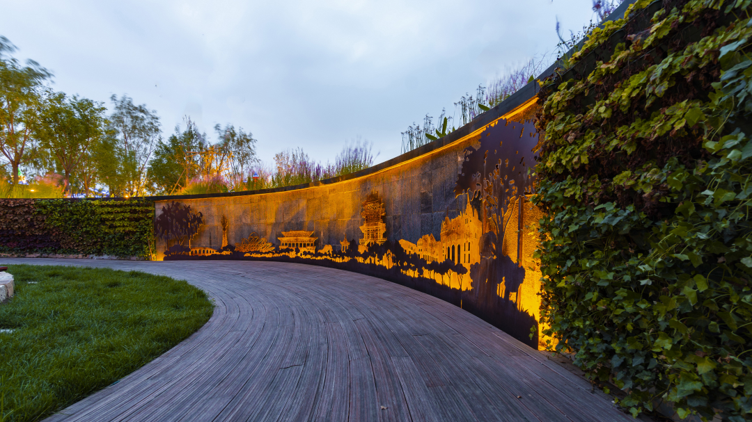 钢材再利用:部分矮墙区域采用废弃锈蚀钢板,体现了生态自然的状态,同时以小见大的表达了唐山的工业文化。