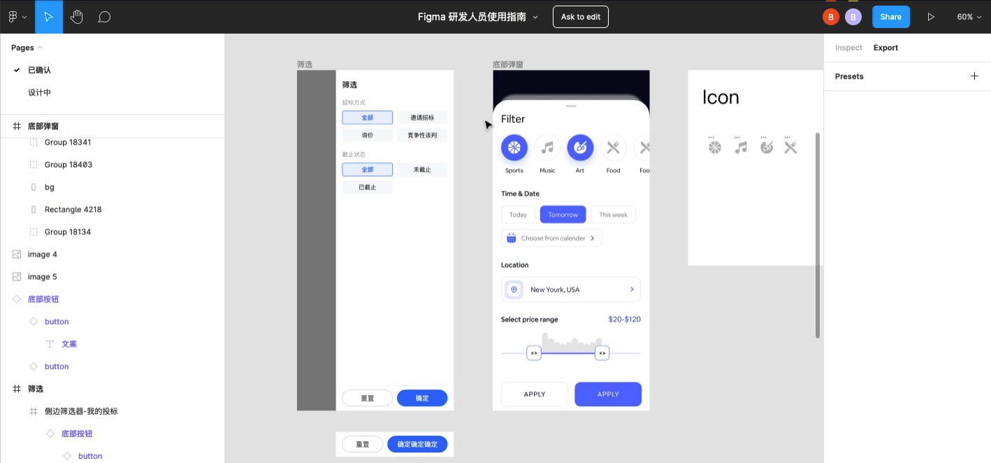 一个 Figma 文件可能会有多个页面,设计同时一般会标注好前端同事需要看哪个页面,例如这张图上的“已确认”页面,表示的就是研发同事只需要以这个页面上的内容开发即可,当然,这个过程中也可以随时和设计师沟通确认。