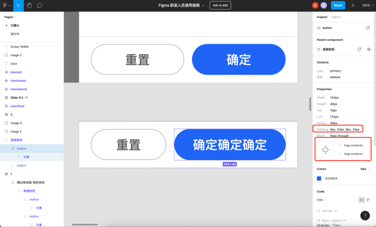 接下来选中图层“button”,可以看到约束:Fill container(填充容器)刚好对应它的上一个图层设置的 Padding 间距