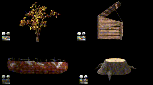 首先我们要打造旧物质感的材质,比如让水看起来像塑料,树叶和草看起来像羊毛和毛毡...而后,我们希望树木的形状比较风格化,且多样。二者结合,就形成了质感厚重,色彩丰富的视觉风格。