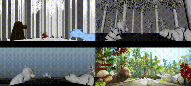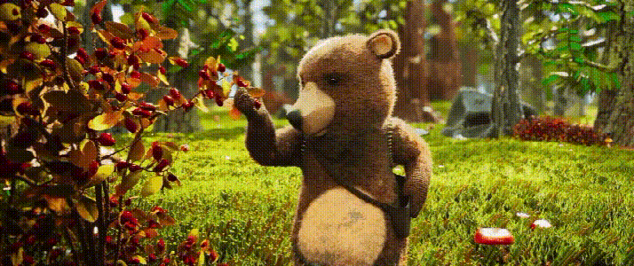 毛织风格的制作为渲染和合成环节带来很多工作量。在处理完动物身上的材质后,我们还需要权衡优化的步骤,因为要控制渲染时间。动画做完后需要确认,熊在移动过程中毛织的材质不会相互交叉,因为毛织不像传统毛发在运动中是可以重合的。合成中也要适当调整,以确保角色的轮廓明朗且美观。