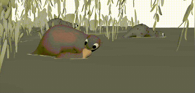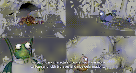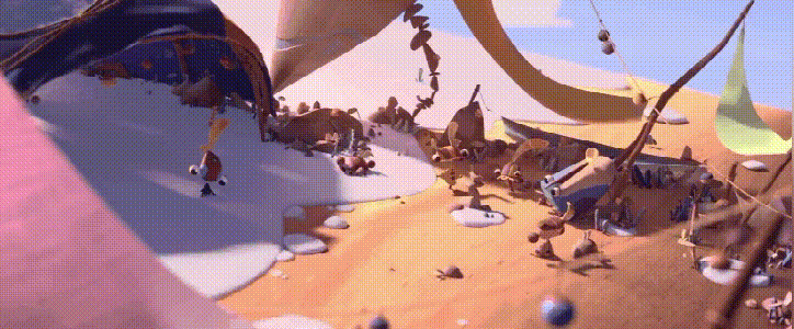 村庄中最多的是植物和岩石,尤其是PP们晚上睡觉靠着的石头,我们希望村庄看起来非常自然,所以每一个元素都会根据特定的环境设计。短片中的植物很多都在阴凉的地方长大,在帆布下,或者在石头周围。每一个元素都是模块化的,所以我们可以在合成中逐个镜头地更改。