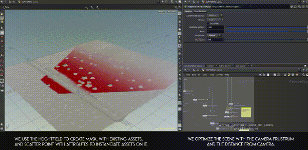 Antoine Dupriez开发了一个Houdini的工具让场景的制作非常高效:我们只需要手动在地面上做一些树,以及一套植被的资产,然后这个工具会根据镜头的信息(如相机的距离,资产名称等)智能地排布这些元素。自动生成的树、草以及二级资产在动画中还不会和角色穿插。这不仅让我们的场景丰富了起来,免去了反复的手动调节,看起来也非常随机,不违和。