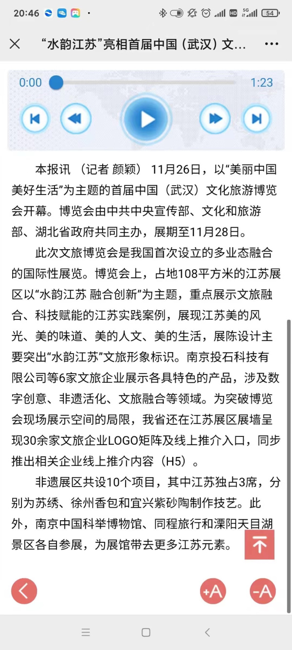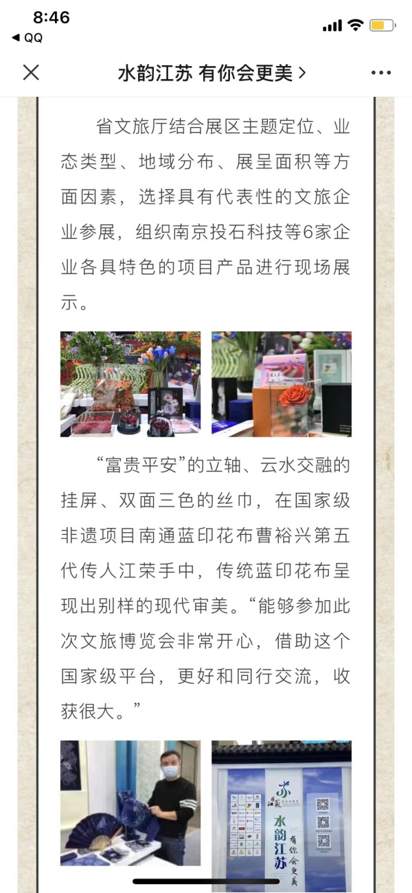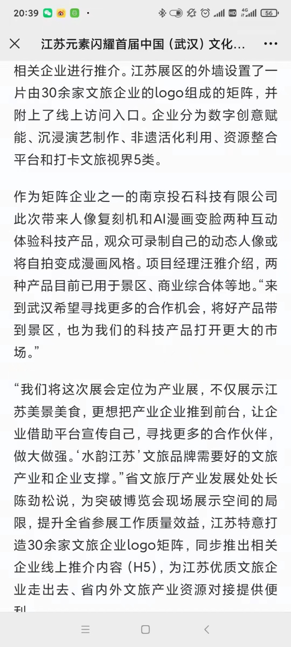 图:学习强国江苏学习平台,新华日报,潇湘晨报等媒体报道:江苏省文旅厅选择南京投石科技等6家企业各具特色的项目产品进行现场展示参加首届中国(武汉)文化旅游博览会。