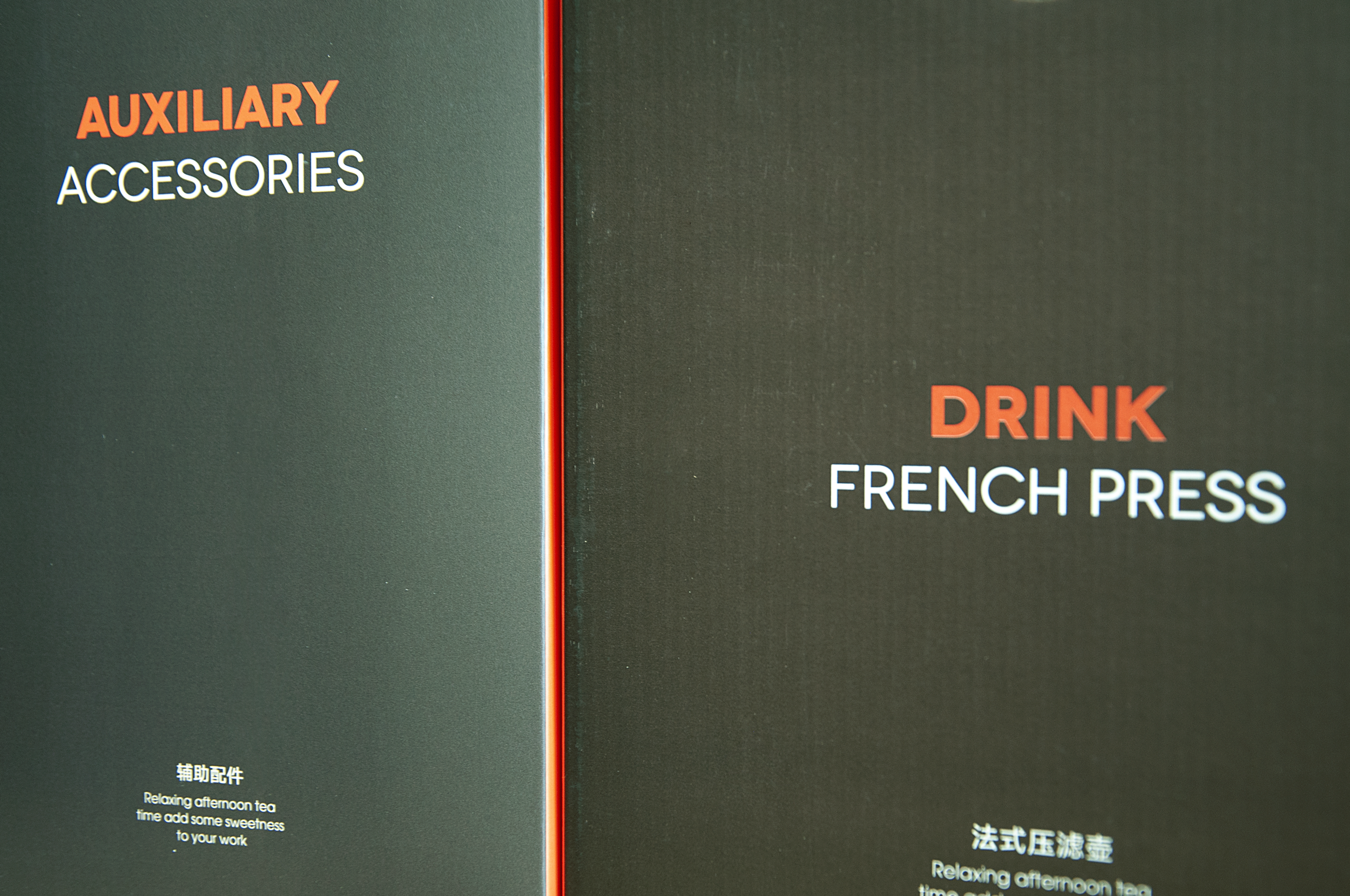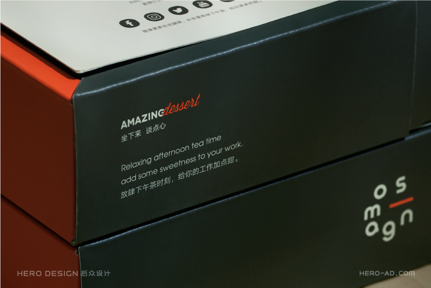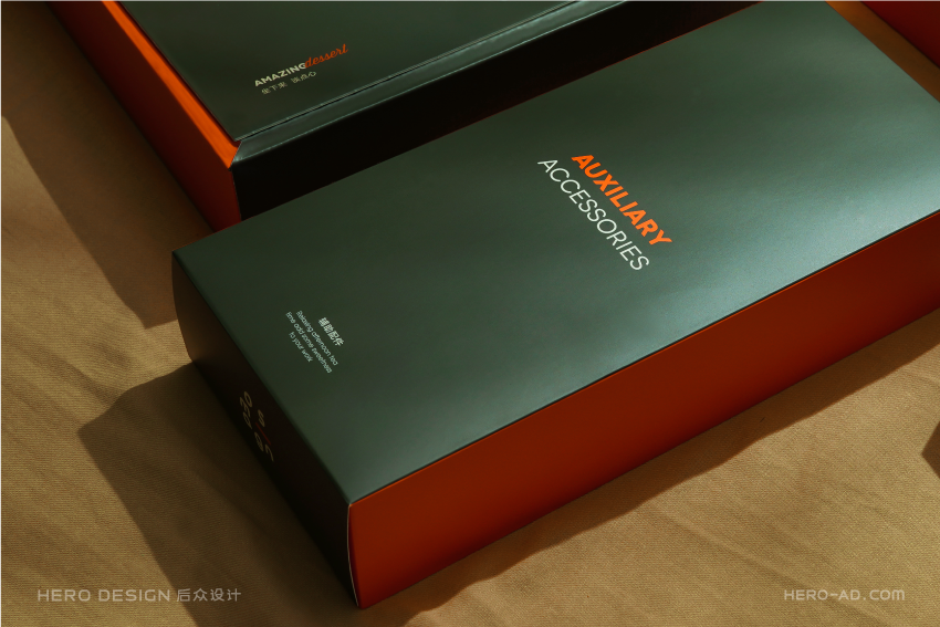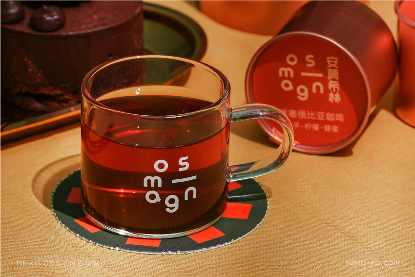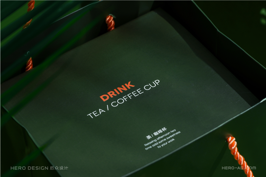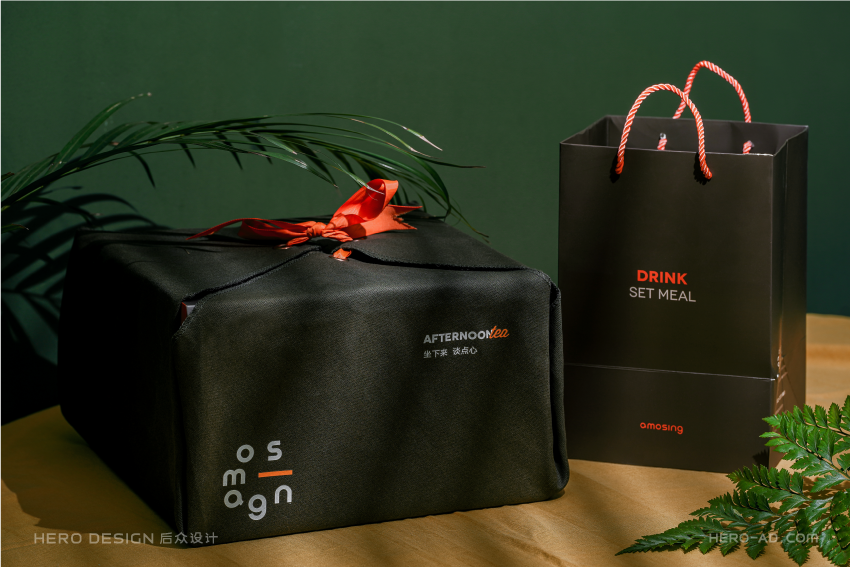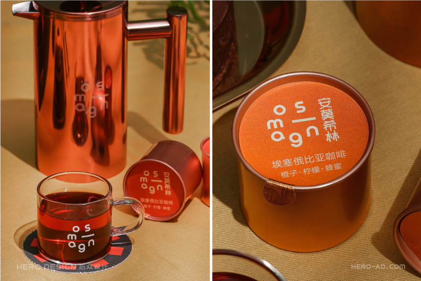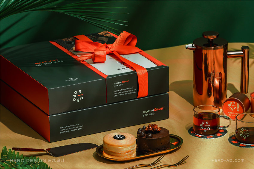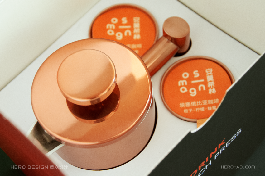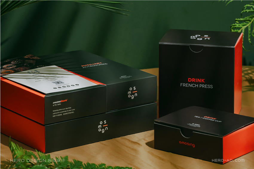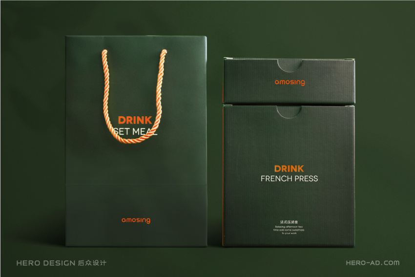 有甜品就要有饮品,安莫希林饮品系列精选国内优质产区所产的武夷红茶和埃塞俄比亚咖啡豆研磨成粉,配合金属法压壶与精致玻璃茶杯,整套饮品包装独立于甜品套餐包装之外,通过对金属法压壶和玻璃茶杯分盒包装的方法,解决在配送时产生的碰撞和安全问题,同时也方便不同套餐产品的搭配。在配送时,依据不同的订单需求,分别配以咖啡或红茶,与法压壶形成一套包装,与玻璃杯盒分层叠摞放置,外部配纸质手提袋,合力构建成安莫希林严谨、科学、统一的饮品包装体系。