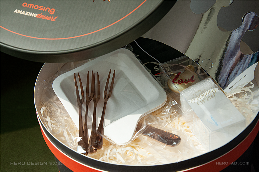后期验证时发现,心蛋糕盒体的上盖由于目前工艺的限制,边缘处总会有一定高度的包边突起,而为了提升消费体验所选择的金属餐具较重,致使附件盒的整体重量较大,这就导致了在配送过程中附件盒容易把蛋糕盒上盖的边缘压坏变形,消费者在拿开附件盒后,看到的是一个变了形的盒盖,视觉感受与消费体验就会大打折扣。