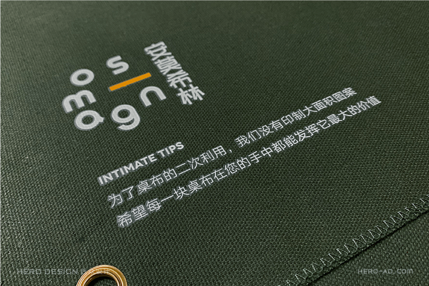为了配合包装二次利用的便利性,我们并未对布料进行大面积的画面印刷,只在角落里印制了品牌标志和品牌Slogan,为了更好的达到二次利用的目的,我们甚至还贴心的印制了一段话语,鼓励消费者将这块布用起来,让产品包装在完成它应有的使命后,依然能在消费者手中发挥它最大的价值。