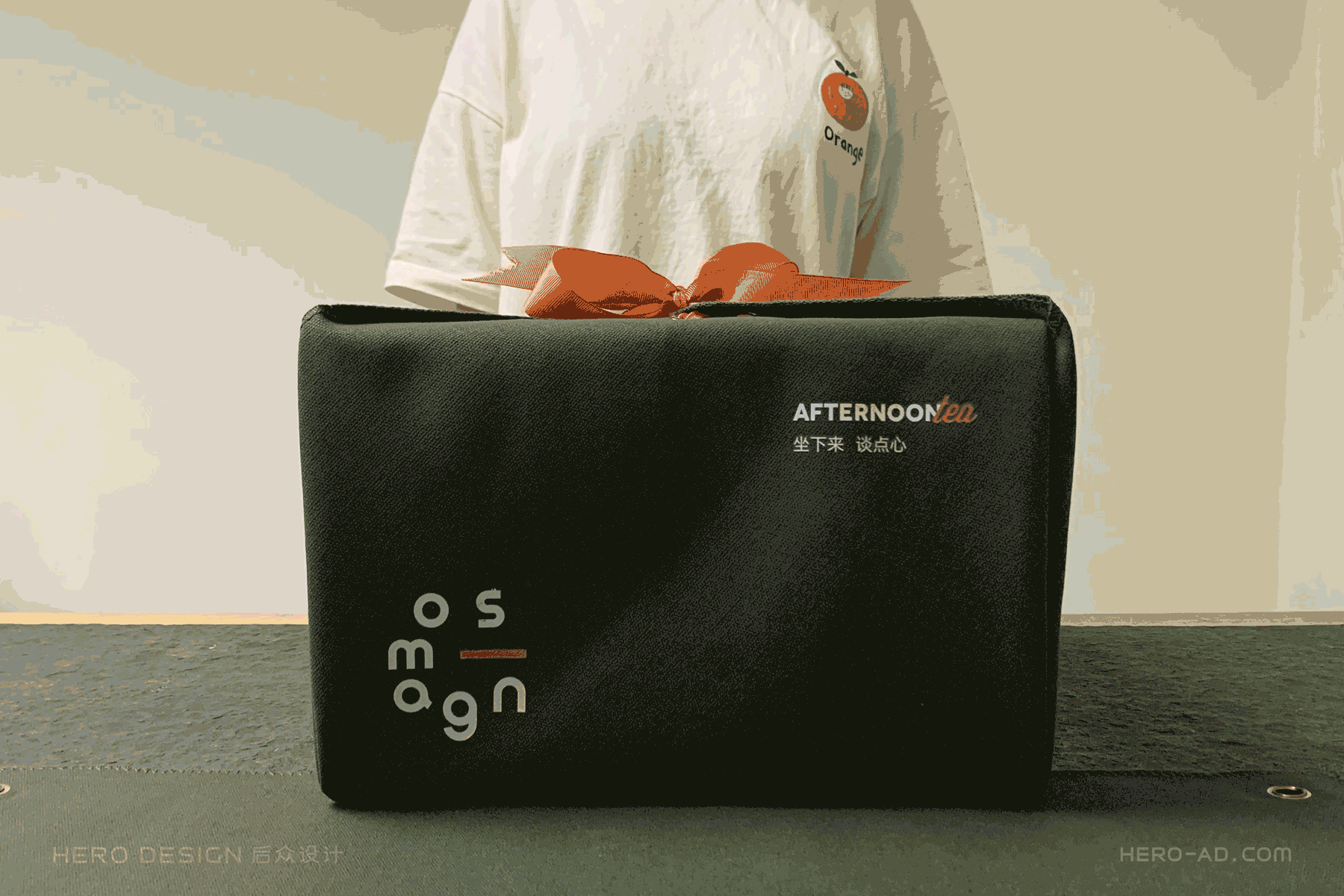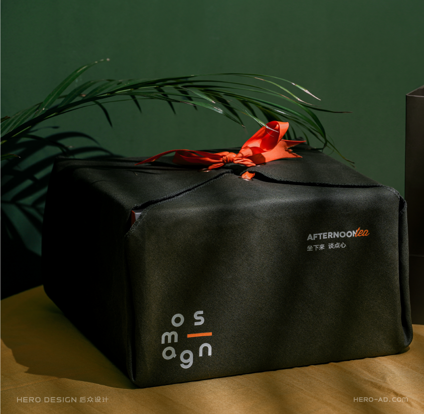 而后经过我们的反复讨论与实验,最终将材质锁定到质地较硬的帆布上面,通过多次的实验模拟我们发现,质地较硬的帆布在产品外包装的反复折叠包裹过程中,无论是挺度,可塑性又或是美观度都能够达到我们的主观和客观的要求。同时,布料材质使得包装二次利用的可能性变得更加丰富,做为下午茶餐食桌布使用完成后,对生活有热情的消费者还可以将其改造为桌布、围裙,甚至帆布包,让其成为装点生活的小道具。同时,我们通过四周打孔的方式,增加了橙色的丝带作为绑绳,一方面起到固定和加固包装的作用,另一方面,丝带的运用,也强化了对品牌字体设计概念的实体化复原。