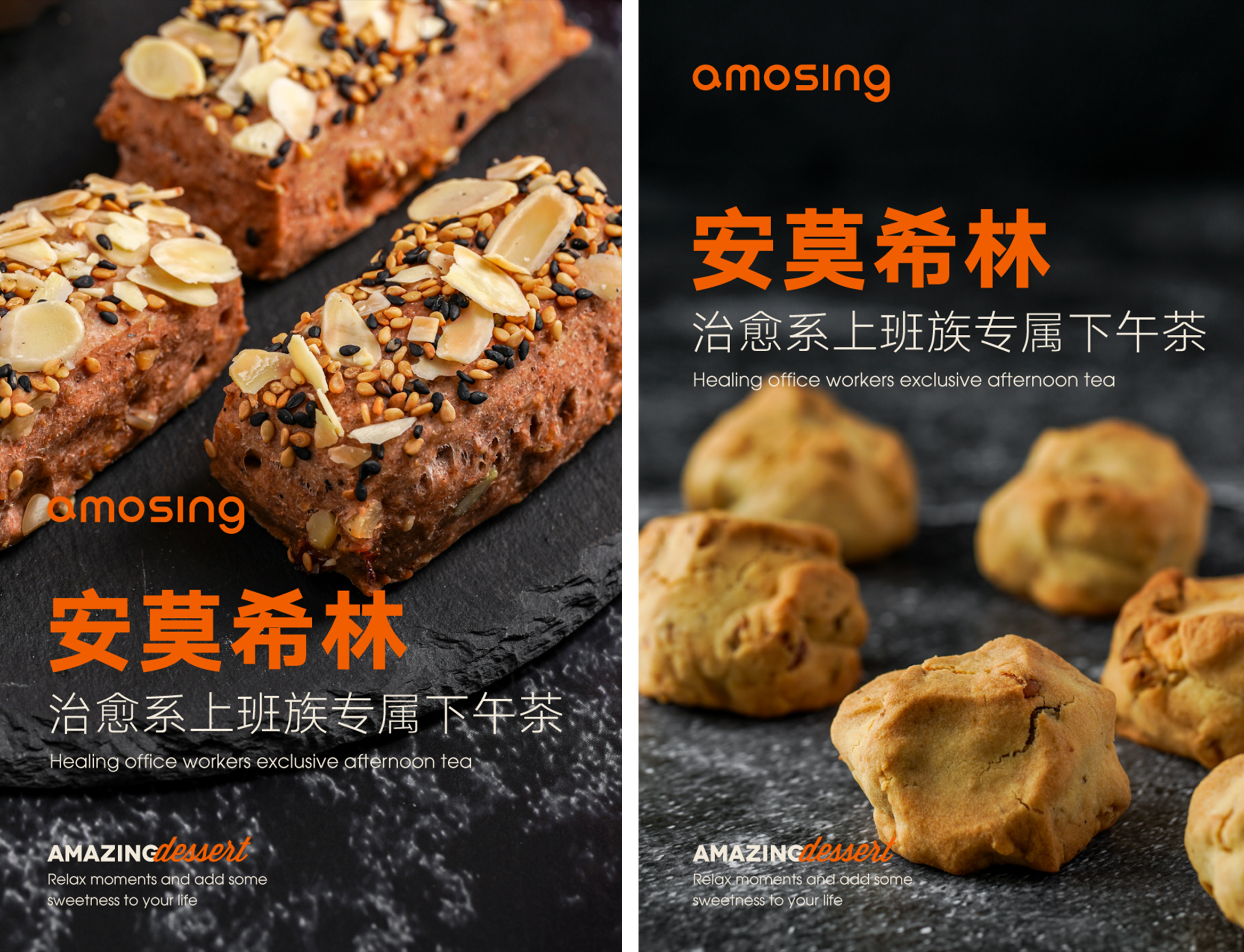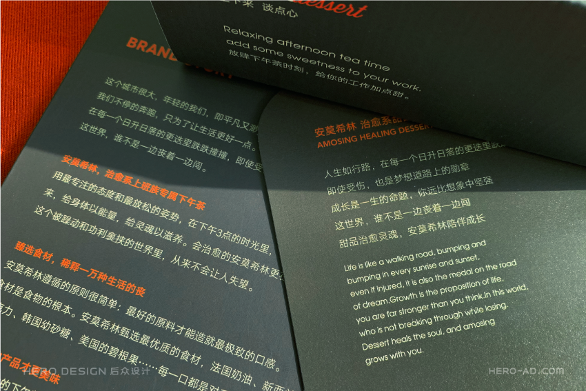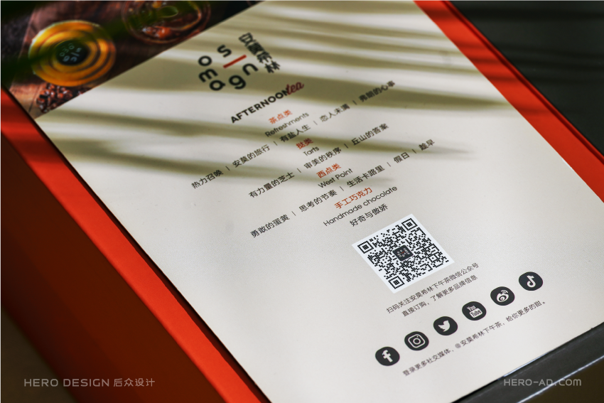 安莫希林下午茶以烘焙甜品为主,搭配精选红茶和手冲咖啡,甜食中的糖分进入人体产生大量多巴胺,传递幸福感,使人产生亢奋的感觉。如何将固定已知的产品导入到目标受众群体,从而形成品牌认知,这就需要我们对市场、对消费心理、对品牌自我优势等的深度挖掘与提炼。