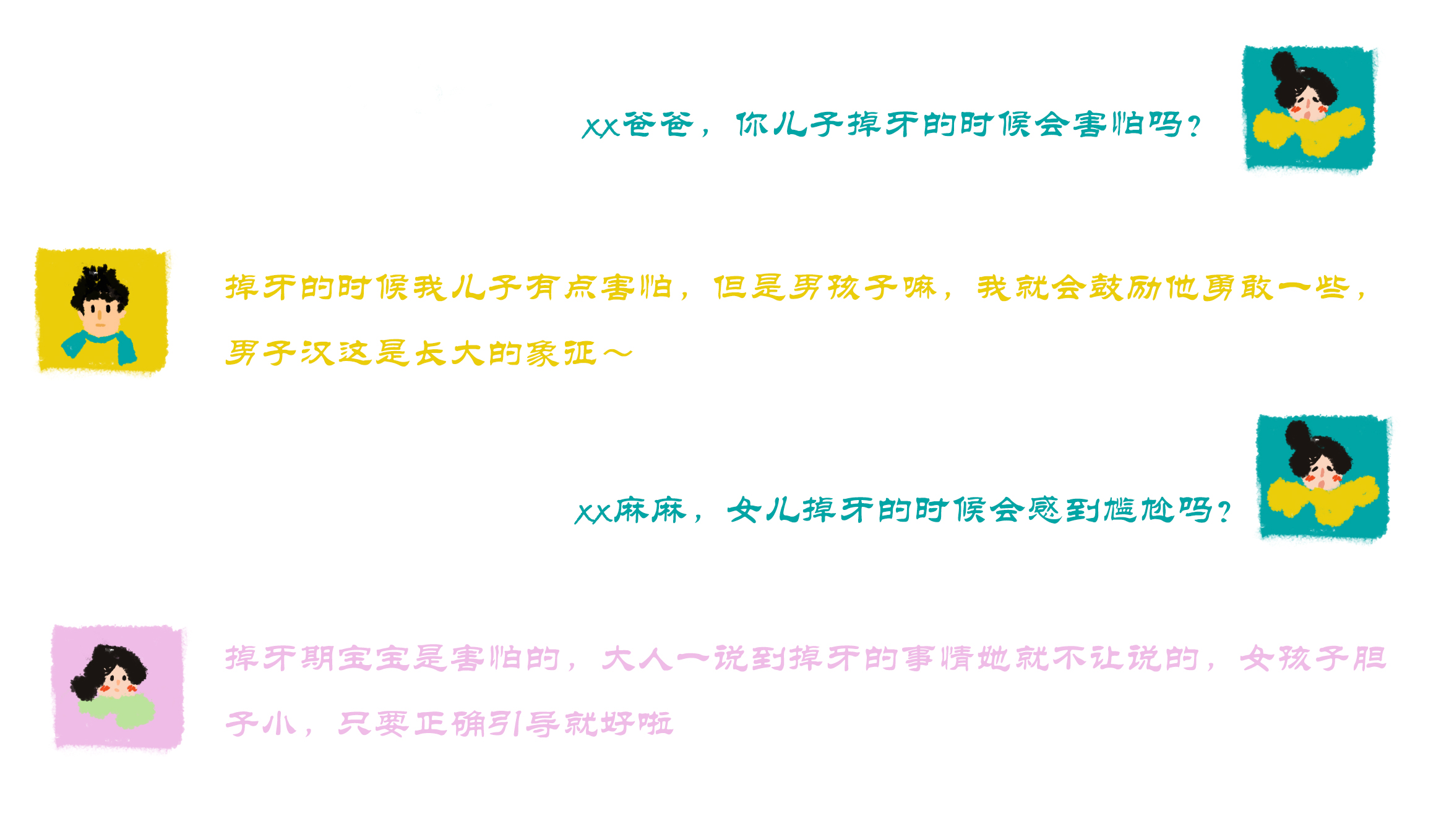 但是因为我接触到的这个小孩子是小模特,经常在拍摄,所以掉牙对于他的影响非常大,于是我在公司中问了很多娃爸娃妈们,他们的宝宝在换牙期会不会害怕、窘迫等等。大多数的宝妈们告诉我说孩子掉牙的时候还是会害怕的,但是很快就会接受这个事情,还有爸爸们说他们会鼓励掉牙的孩子,告诉他们这是成长的象征。