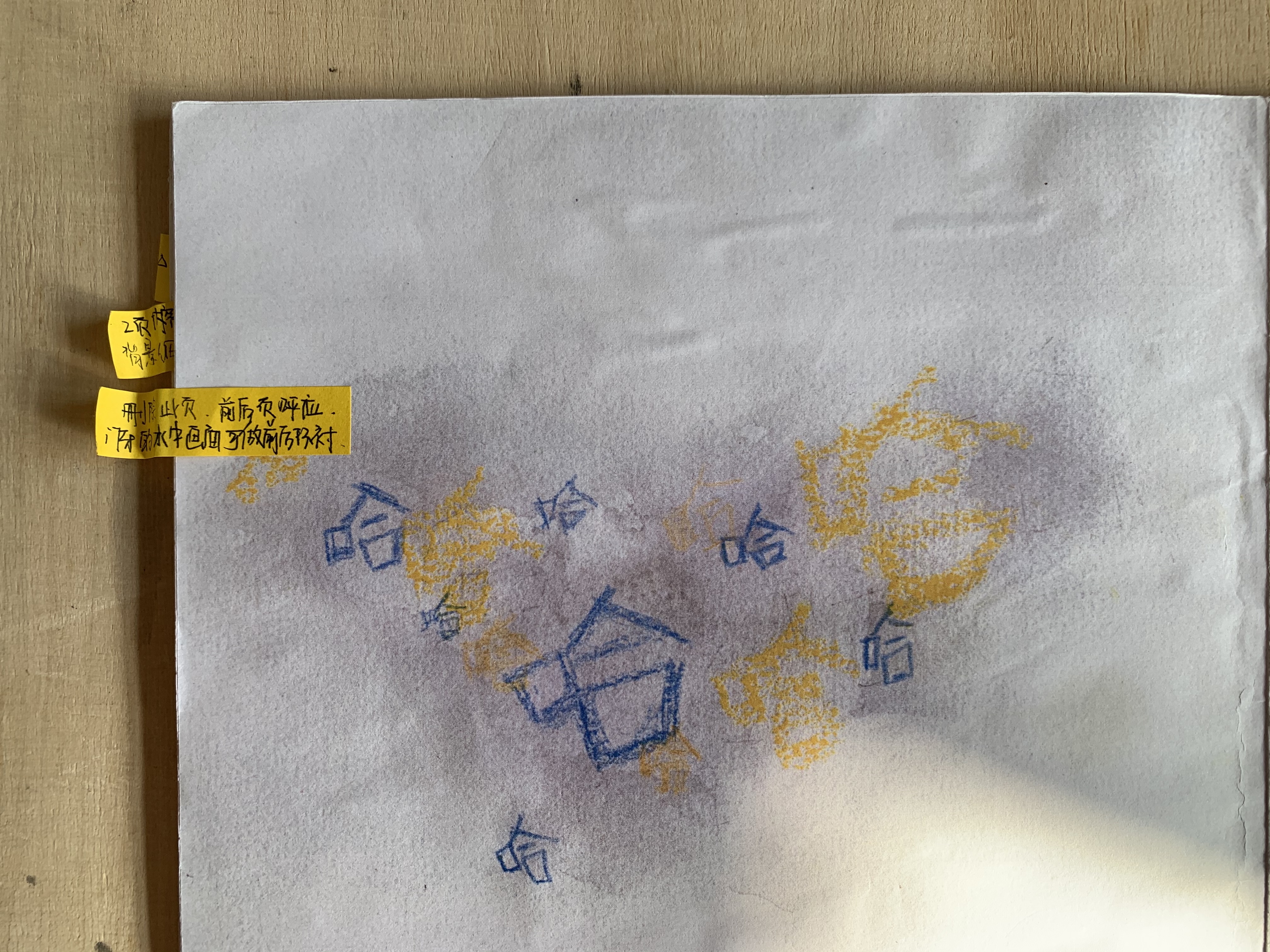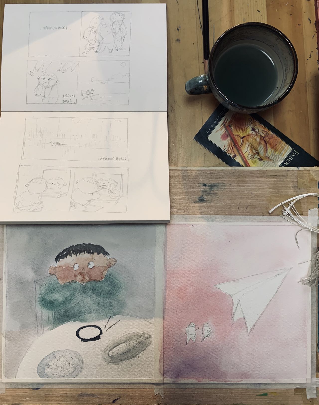 对于我的这个故事,当时我设置了20cmx20cm的一个正方形小开本,所以直接裁出来40x20cm的水彩纸就开始尝试着上色了,当时的技法也不成熟,对于水彩的把控和其他技法也并不完善。但在不断推进画面的时候,逐渐建立的自信心,老师也鼓励大家多做尝试。