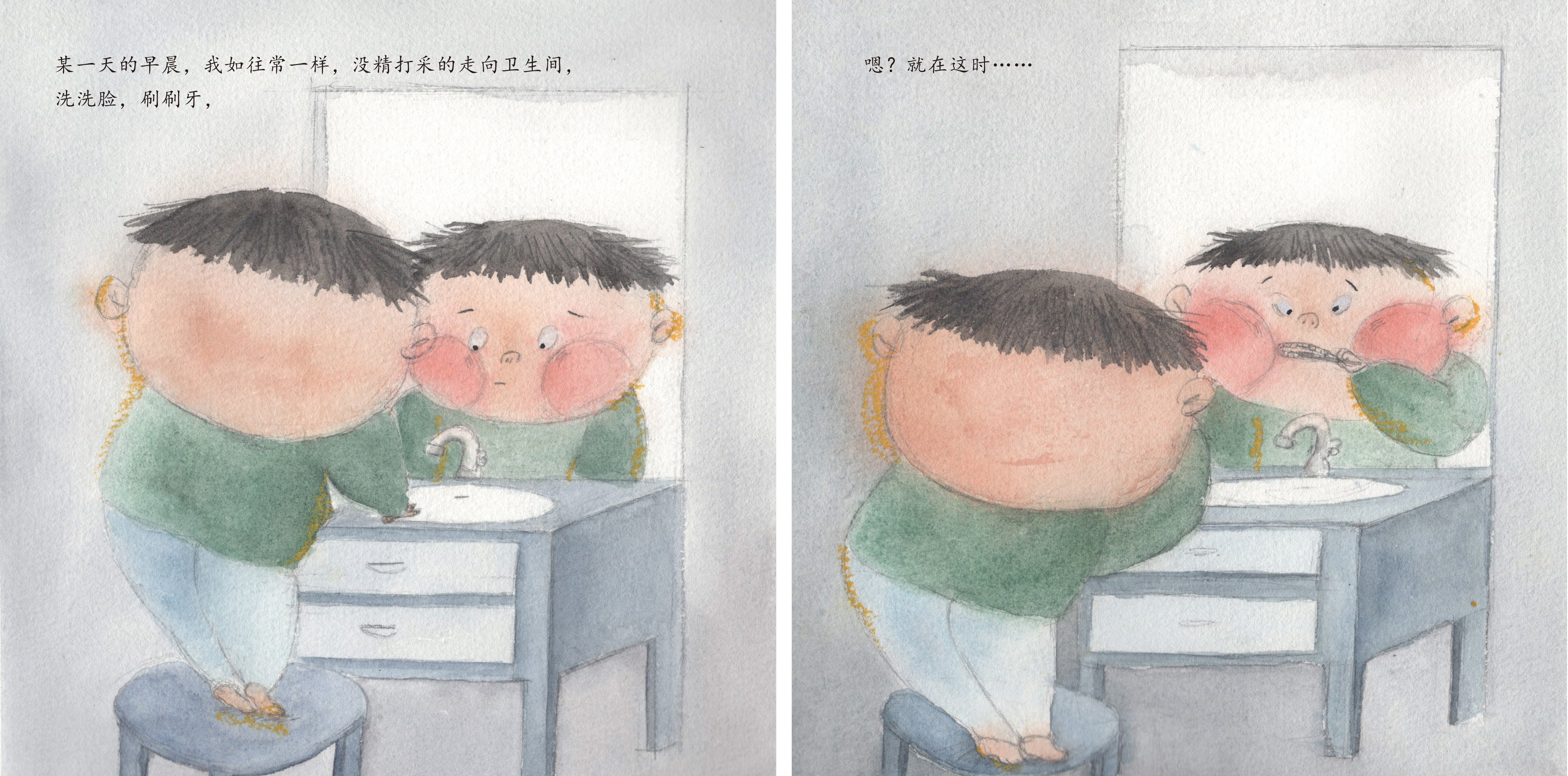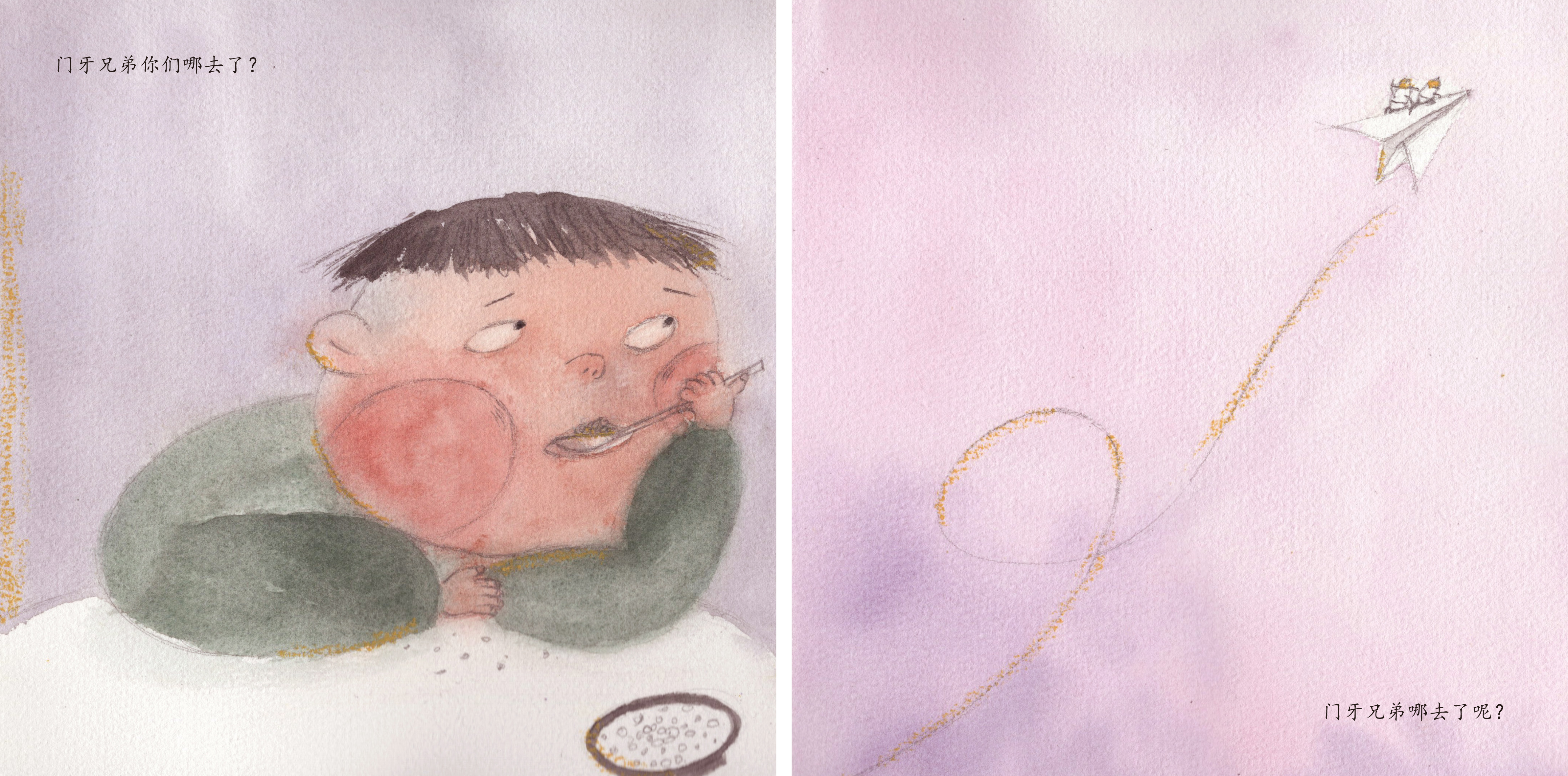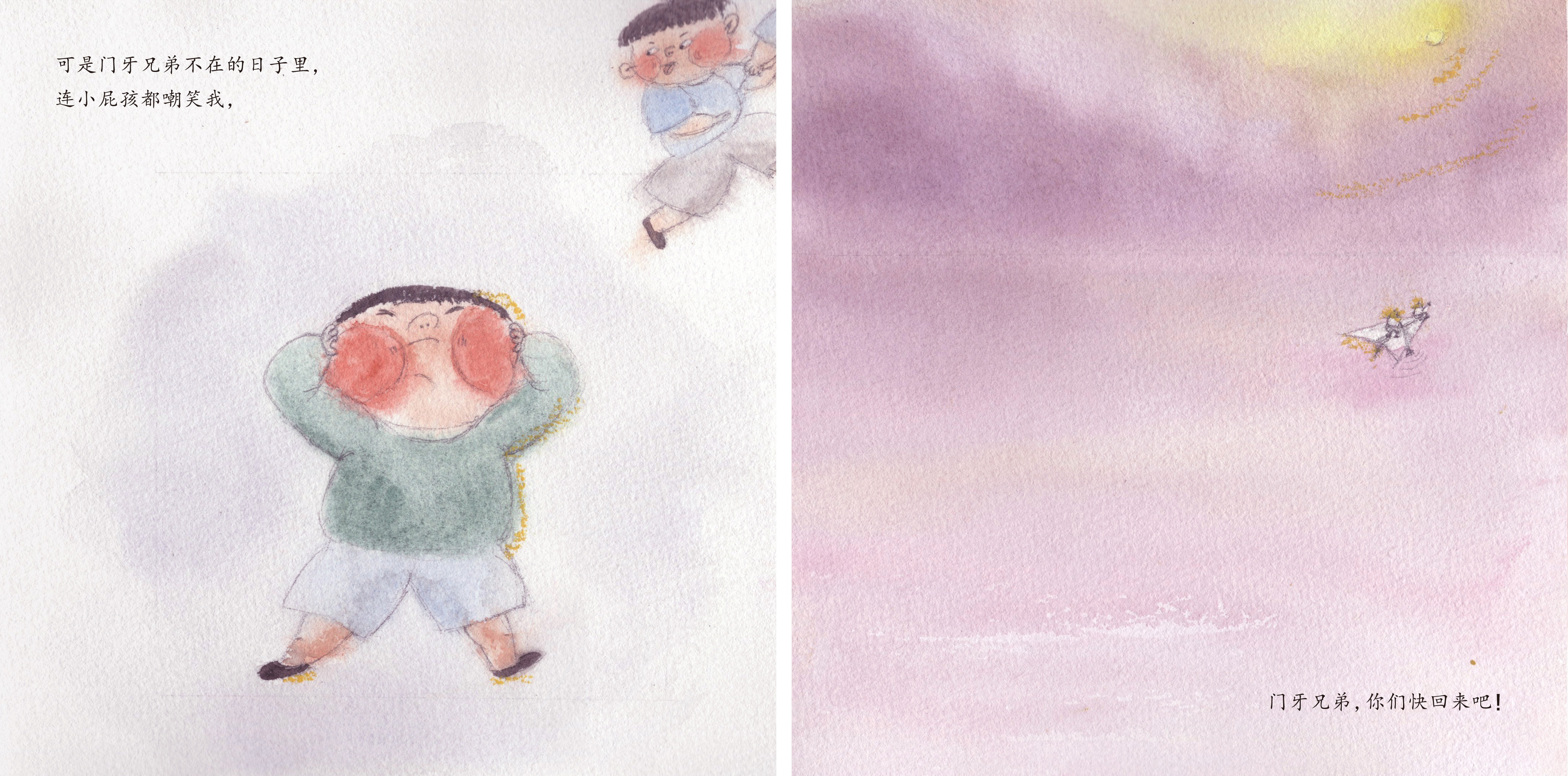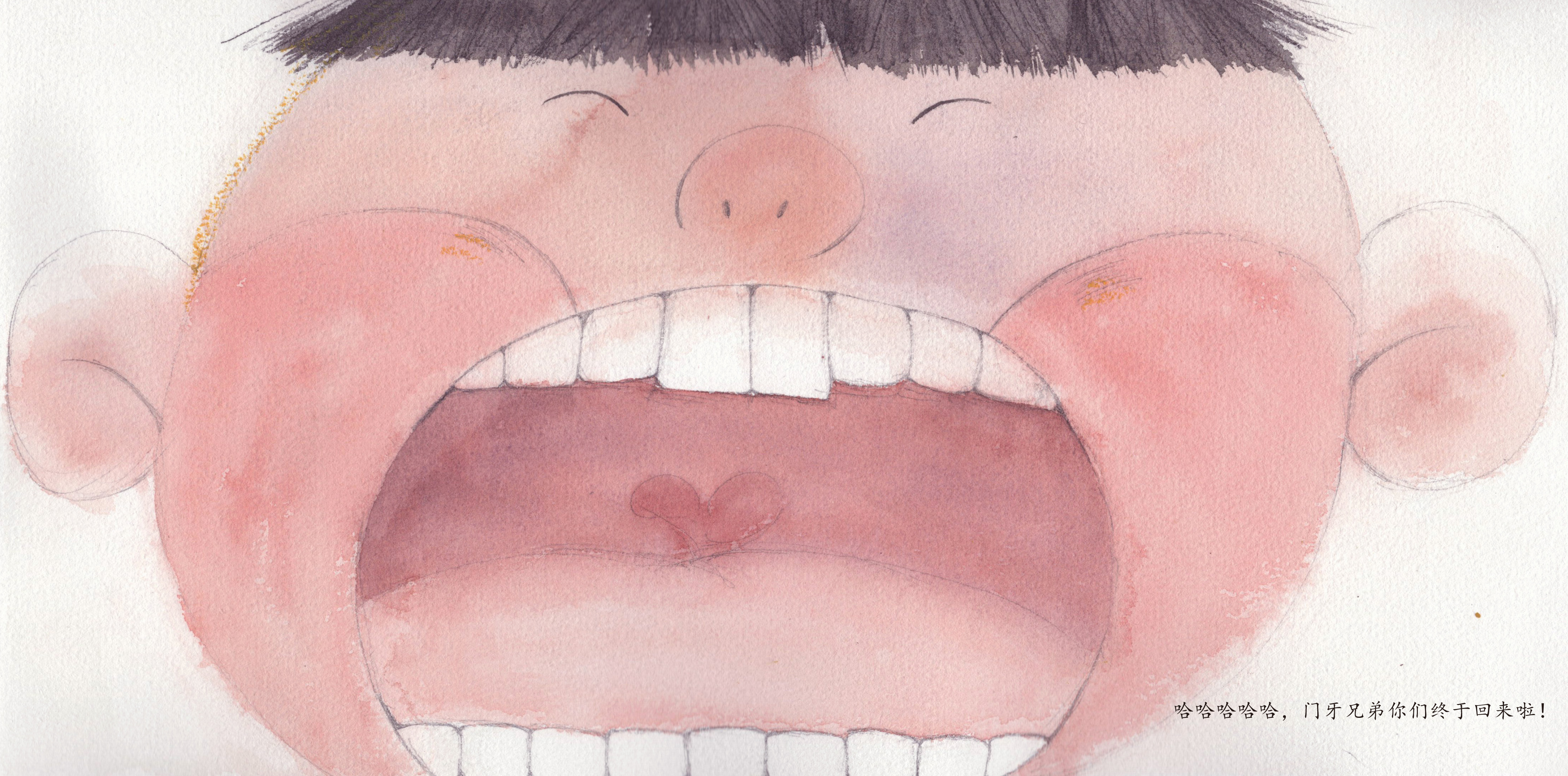 【门牙兄弟】讲述了一个小男孩掉牙的故事,两颗大门牙跑出去痛痛快快玩了一圈儿,累趴下后回到了小朋友的嘴里。其实在这里我设置了一个小小的伏笔,前后环衬中交代了牙齿的去向,旧牙齿不会再回到小男孩的嘴里,最后回来的牙齿是新长出来的小牙~(会比原来的牙齿突出一点点)
