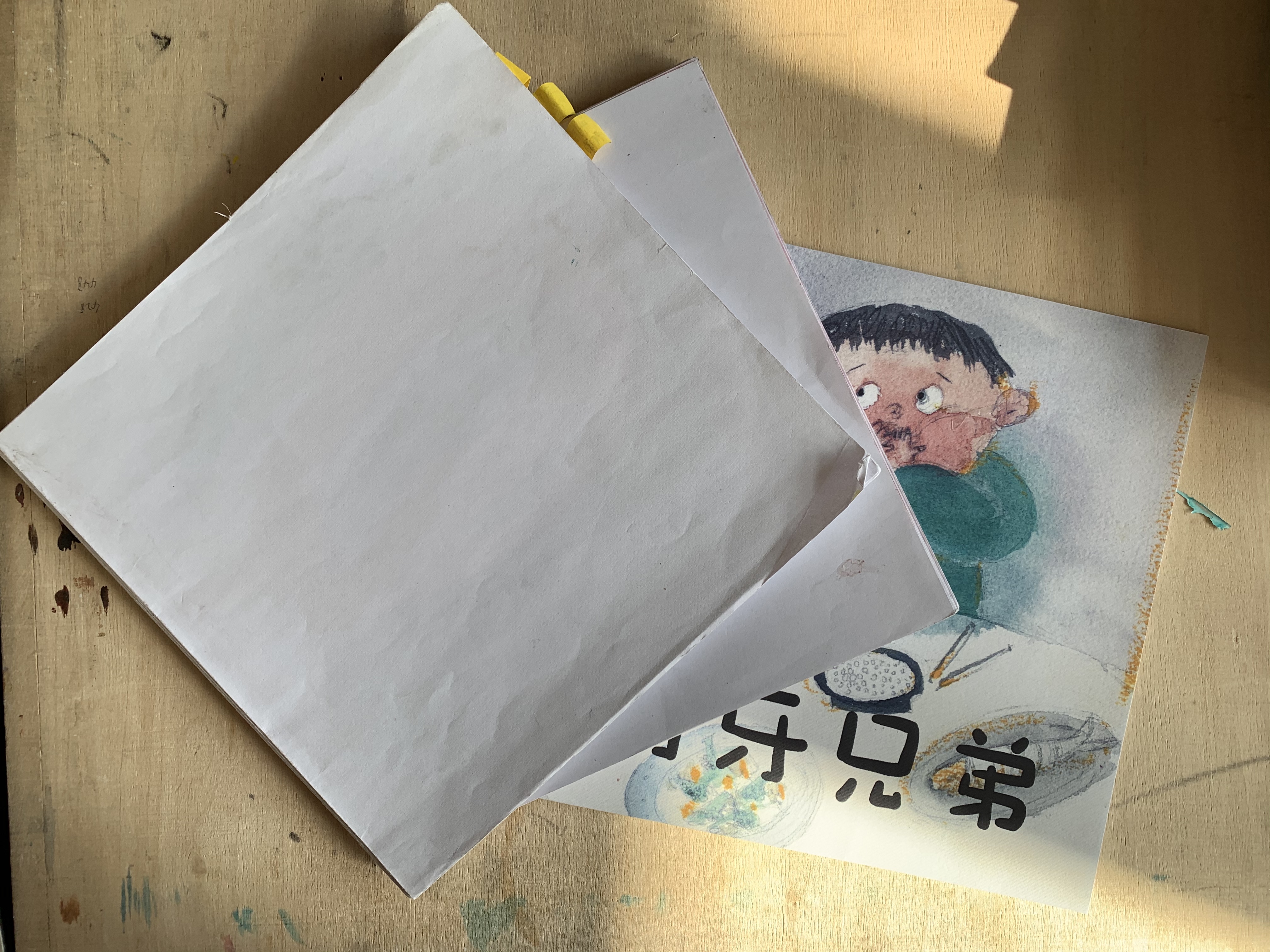 小样书的制作:关于小样书,每个绘本画家都有自己的制作流程,比如分镜稿确定后可以做一版很小的小样书来测试绘本翻页的流畅程度,在色稿画完之后也可以再制作一遍。因为我没有画色稿,在推进完所有故事画面后开始做样书,一共调整了3版。在完成第一本小样书的时候我会用小角标来标注画面上出现的问题,第二版本调整后会更改存在的问题。