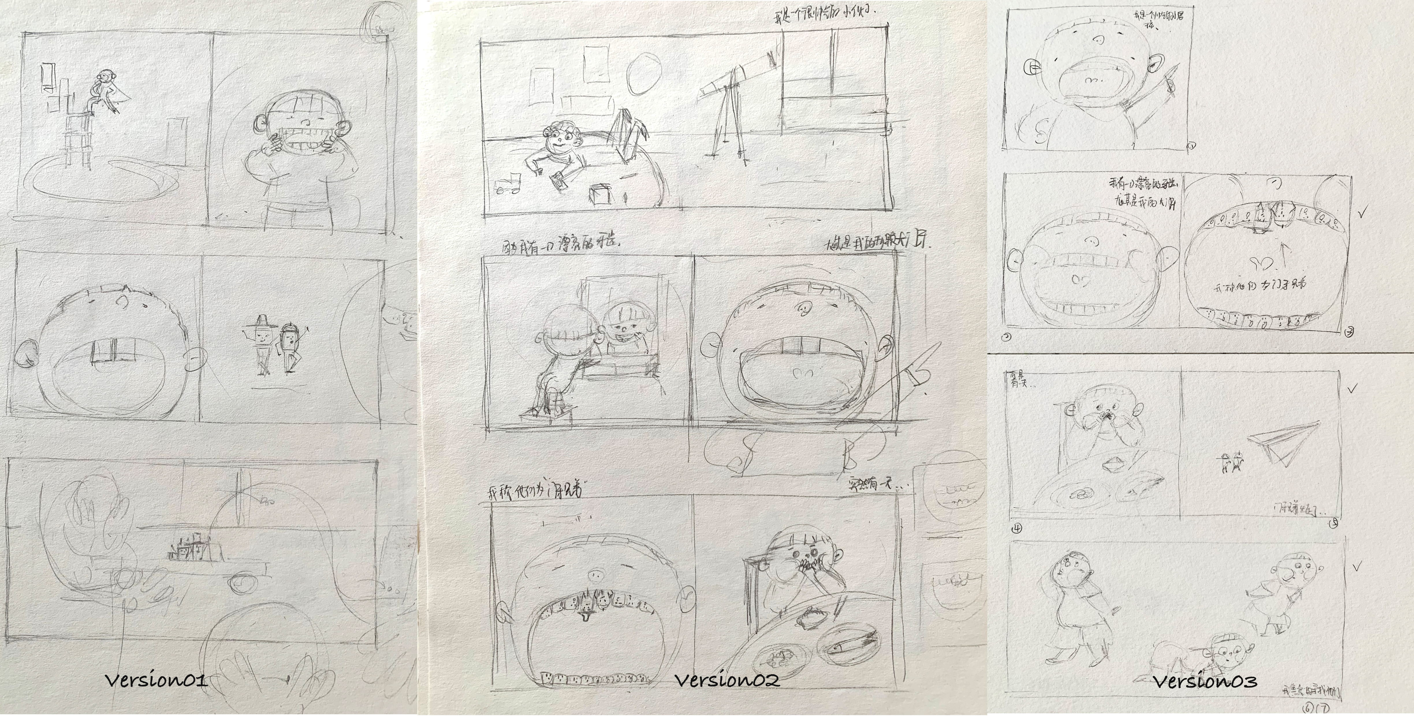 以上的草图3个版本其实还不是最终的定稿,5天的训练营只是第一次捋顺了故事,让我们进行到了色稿和画出1-2张正稿的基础上,在后续的1年时间内,我自己又反反复复更改了故事的细节以及分镜稿。