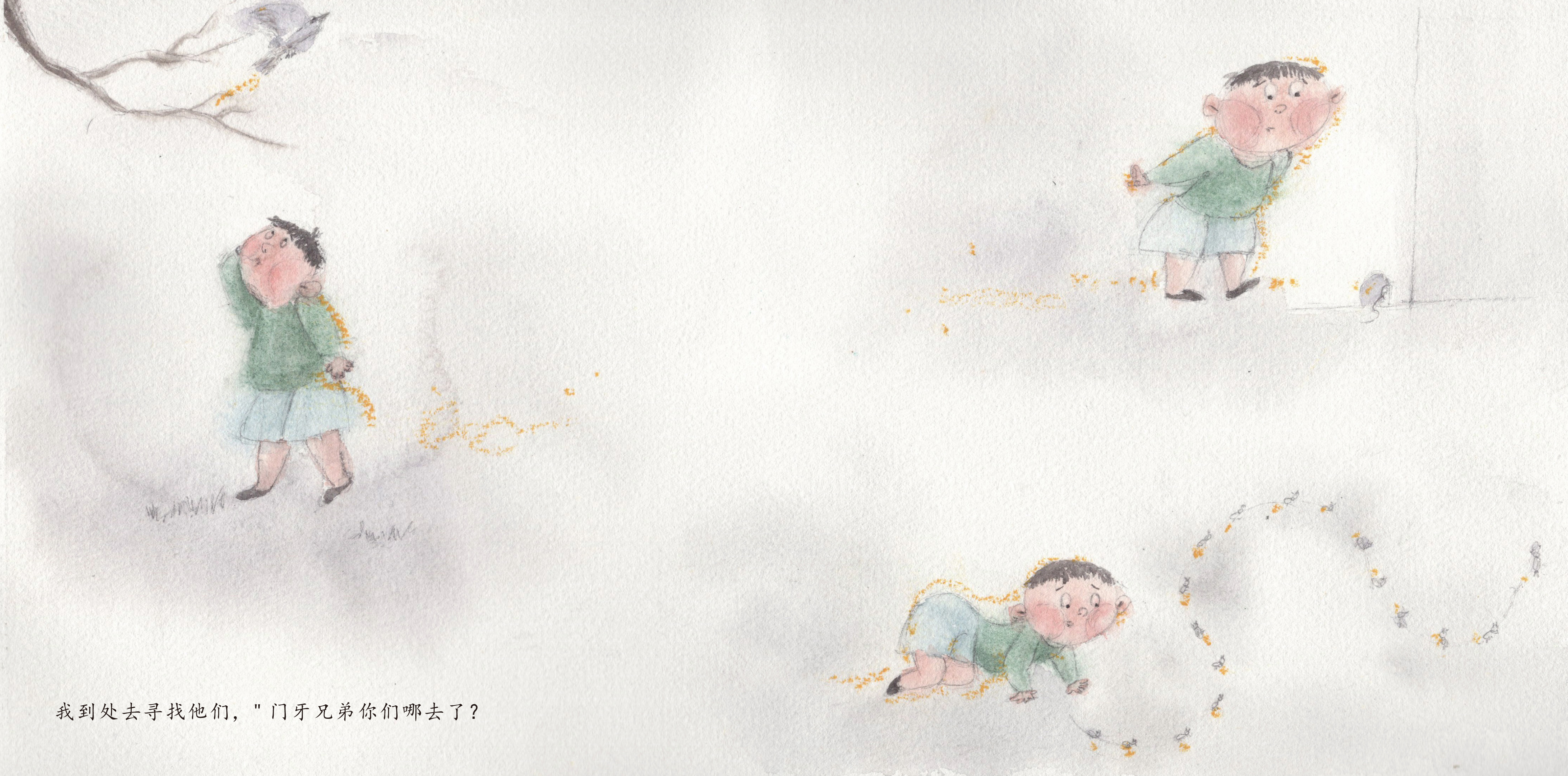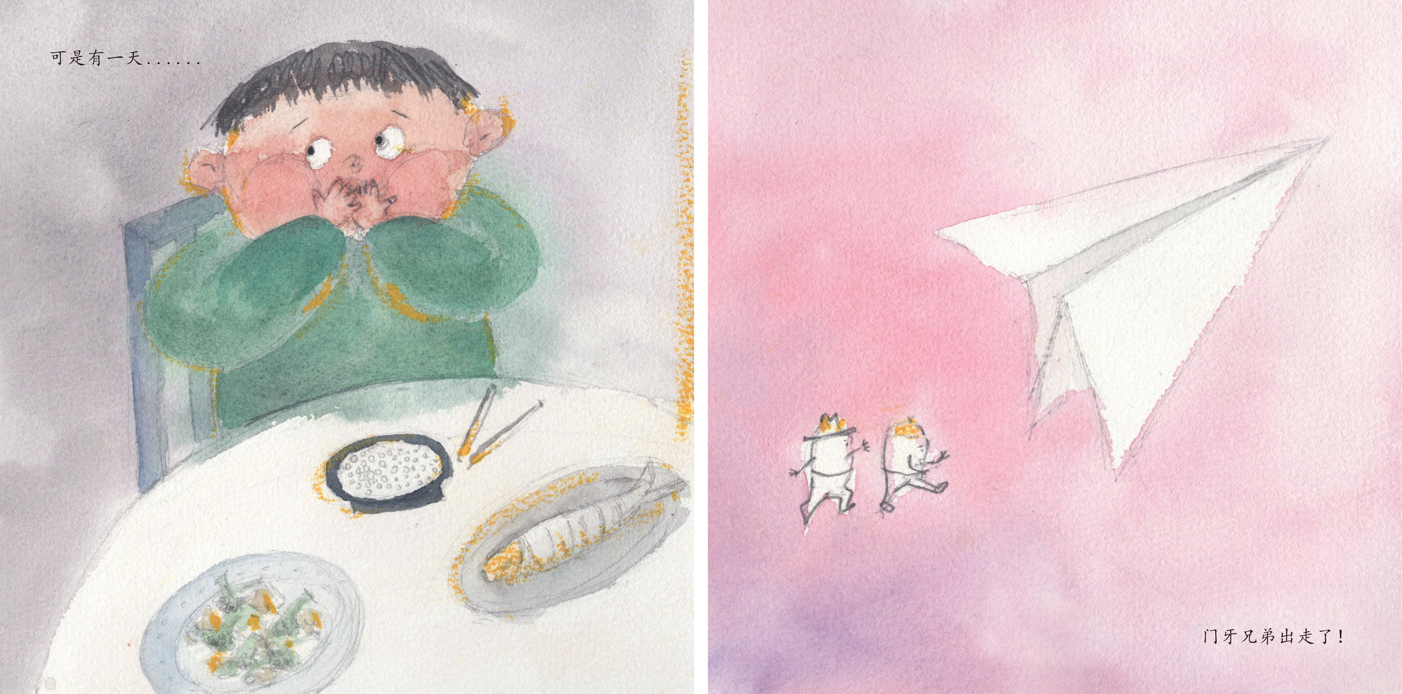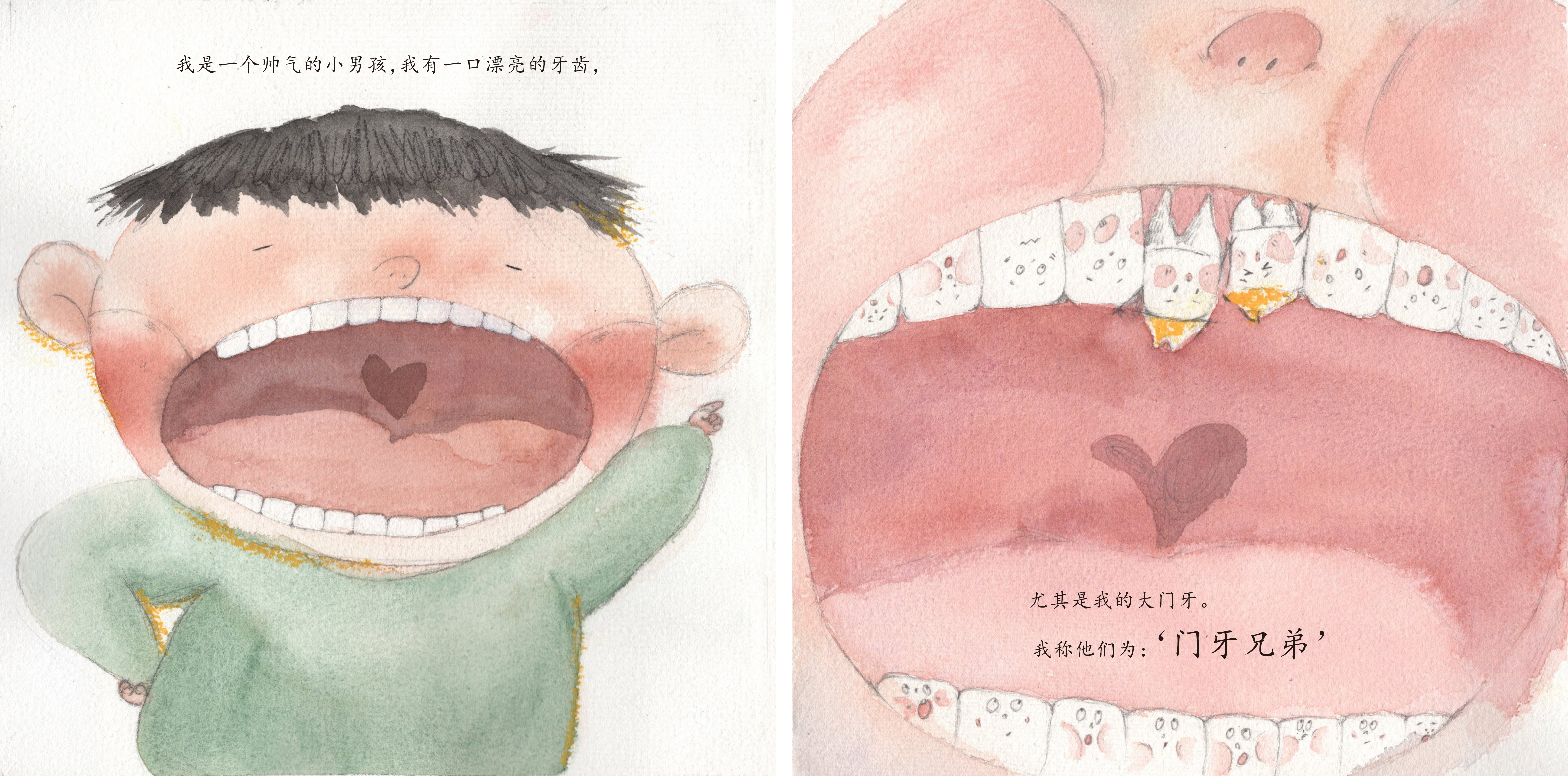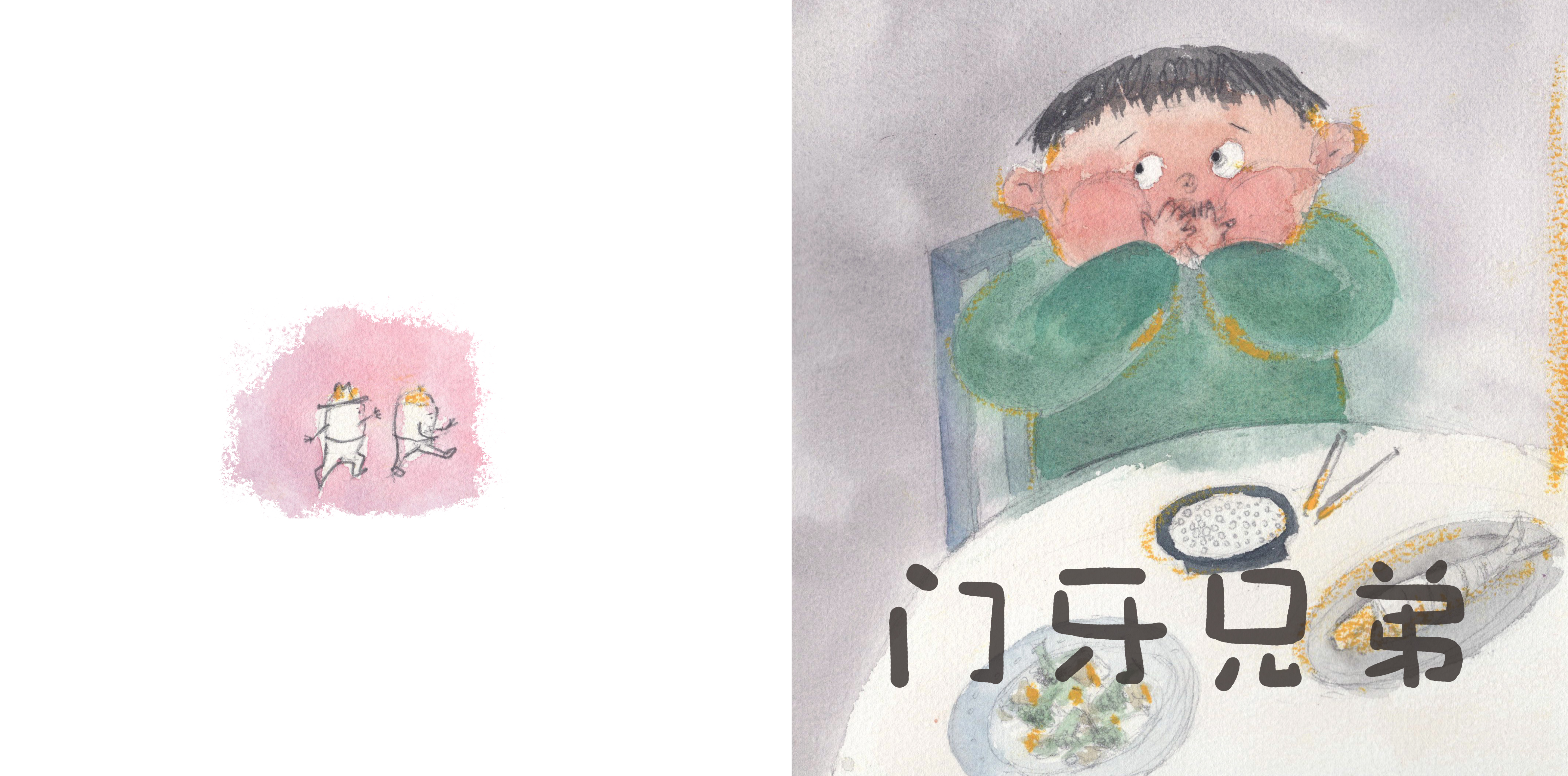 【门牙兄弟】这个小绘本故事的灵感起源于之前在上海工作时,我为公司的新品组织拍摄,请来的小模特正好处于掉牙期,他非常的害羞,害怕漏出自己缺掉的两颗大门牙,大人们觉得孩子们可爱,可是小朋友在这个尴尬期会多多少少有些窘迫,于是就诞生了一个Idea:是不是可以把小孩子掉牙这件事情作为一个切入点绘制一本绘本呢?
