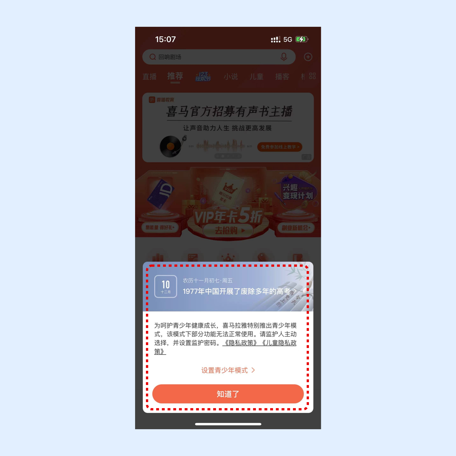 进入喜马拉雅后,弹出设置青少年模式的弹窗,点击设置跳转设置青少年模式,点击知道了进入首页开始使用。