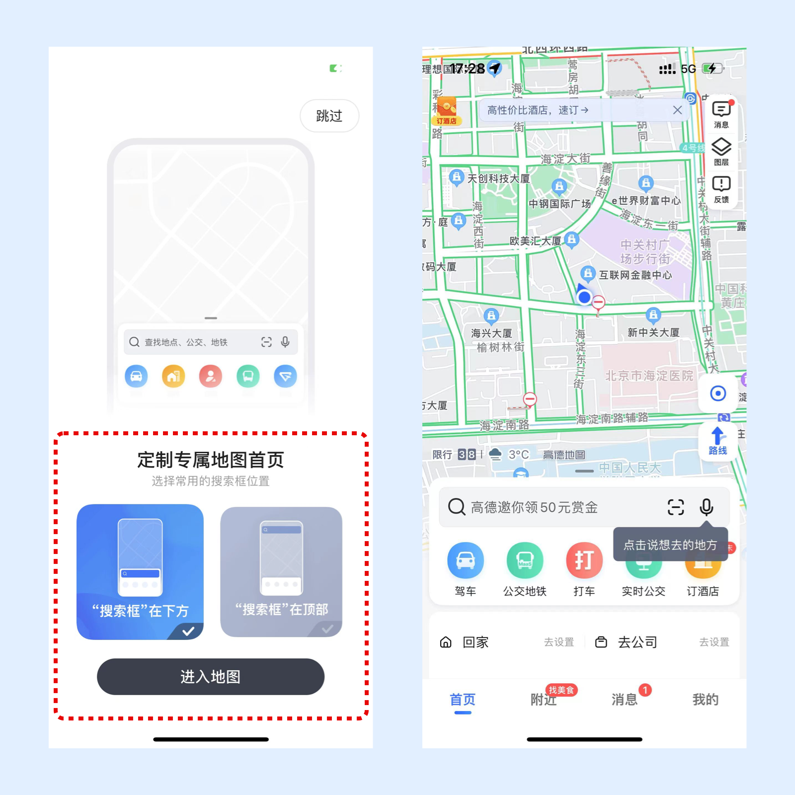 下载高德地图启动后,首次开启后会提示可以选择两种模式的布局。一种为搜索框在顶部,另一种是搜索框在底部的。